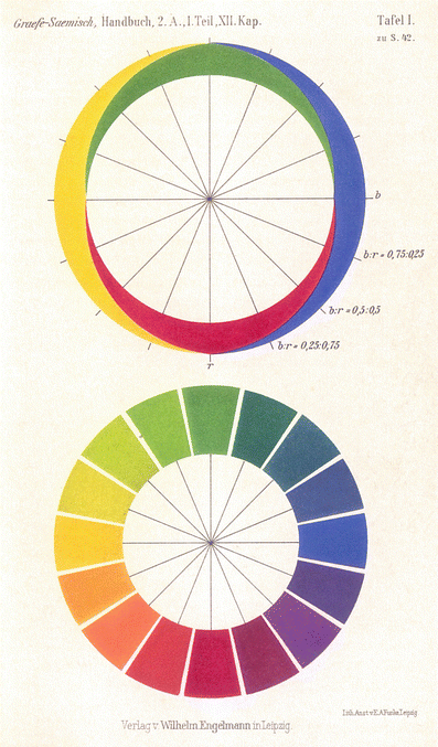 17세기 후반에 아이작 뉴턴이 프리즘으로 태양광을 분광하여 스펙트럼을 추출하는 실험을 했지만, 18세기의 색채 이론 전문가들은 이를 의식하여 빨강·노랑·파랑을 삼원색으로 생각했다. 이들은 기본적인 감각의 특성으로 추정되었으며, 모든 물리적인 색상에 대한 감각이나, 안료 및 염료의 물리적인 혼합에는 이 세 가지 색이 섞여 있다고 생각했다. 그러나 빨강·노랑·파랑의 세 가지 색상 혼합으로는 다른 모든 색을 만들 수 없다는 많은 반증이 있었음에도 이 이론은 독단으로 굳어졌고, 오늘날까지 이 생각이 남아 있다.[127]