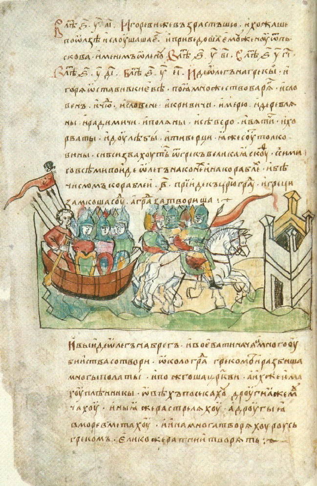 907년 루스-비잔틴 전쟁 중 현명왕 올레그의 콘스탄티노폴리스 원정 (''라지빌 연대기''에서)