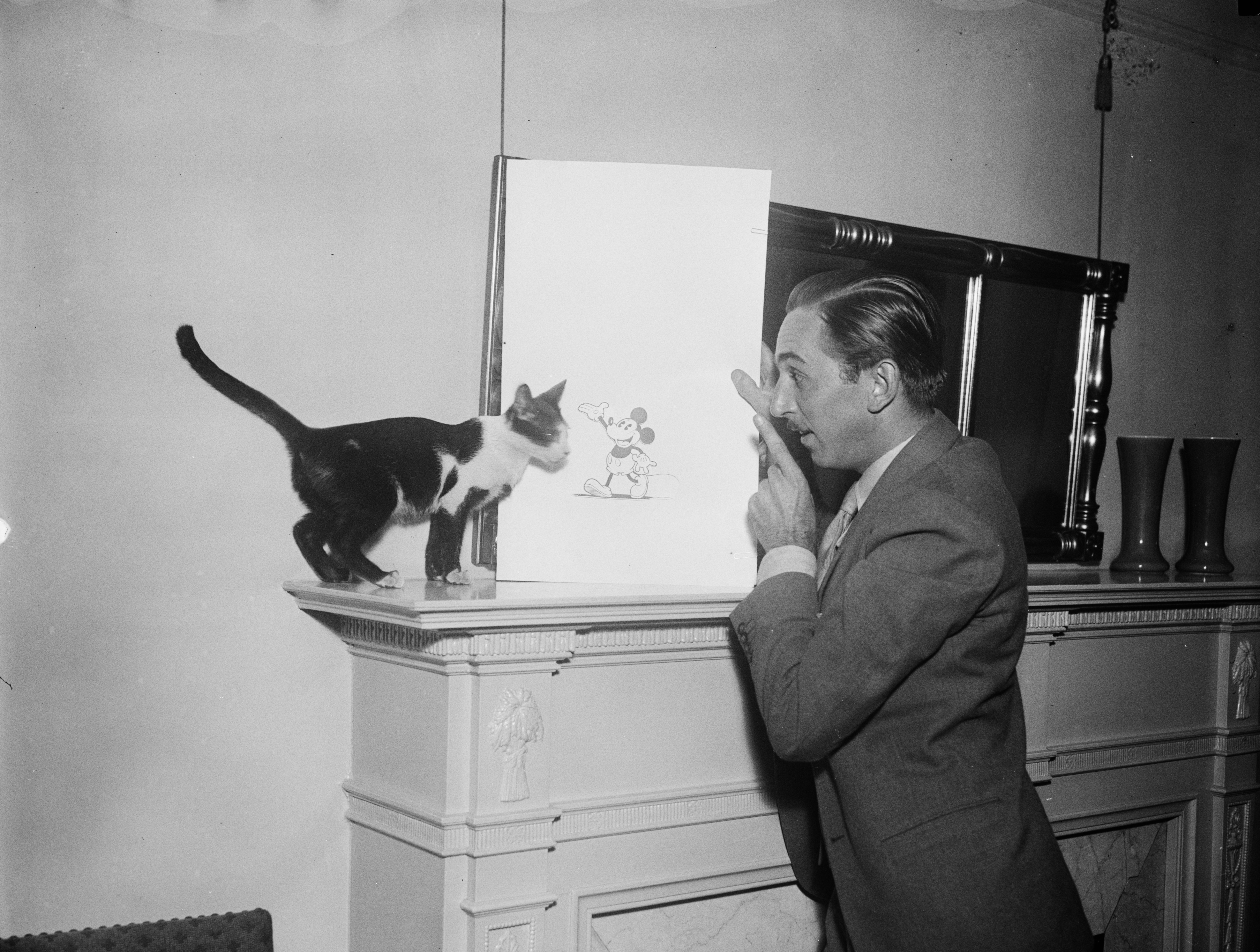 오스왈드 래빗으로 인기를 얻었지만, 배급자 찰스 민츠와 월트의 직원이었던 애니메이터들은 월트를 배신했다. 월트는 뉴욕에서 돌아오는 길에 화를 억누르며 짧은 시나리오 한 편을 썼다. 대서양을 횡단한 비행사 찰스 린드버그에게서 영감을 받았으며, 제목은 'Plane Crazy(미친 비행기)'였고 주인공은 쥐로 결정했다. 이 수컷 쥐는 오스왈드와 비슷했고, 월트의 회사에서 유일하게 월트 편이었던 어브 아이웍스는 오스왈드의 귀를 줄이고 코를 통통하게 그린 캐릭터로 수정했다. 아내 릴리언 디즈니의 의견으로 미키라는 이름을 지었다. 이 캐릭터가 현재까지 월트 디즈니 컴퍼니를 대표하는 '''미키 마우스'''이다. 이후 미키 디자인은 조금씩 개선되었다. 미키 마우스 원형 디자인은 실제 쥐와 다르게 귀 부분을 둥글게 강조했다. 초창기 애니메이션에서도 귀 모양은 항상 둥글었다. 이런 디자인으로 시청자들은 미키 마우스를 쉽고 빠르게 알아보았다. 현재 이 귀 모양은 미키 마우스의 비공식적인 트레이드마크가 되었다. 오늘날까지 디즈니사에서 둥근 귀 로고는 미키 마우스를 상징한다.
