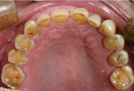에나멜질 부식의 징후는 페리키마가 없는 매끄럽고 비단결같이 광택이 나며 때로는 둔탁한 에나멜 표면이 잇몸 경계를 따라 온전한 에나멜과 함께 나타나는 것이다.[28] 수복물이 있는 사람의 경우, 치아 구조가 일반적으로 수복 재료보다 훨씬 빠르게 용해되어 주변 치아 구조보다 "위로 솟아" 보이는 것처럼 보이게 된다.[29]