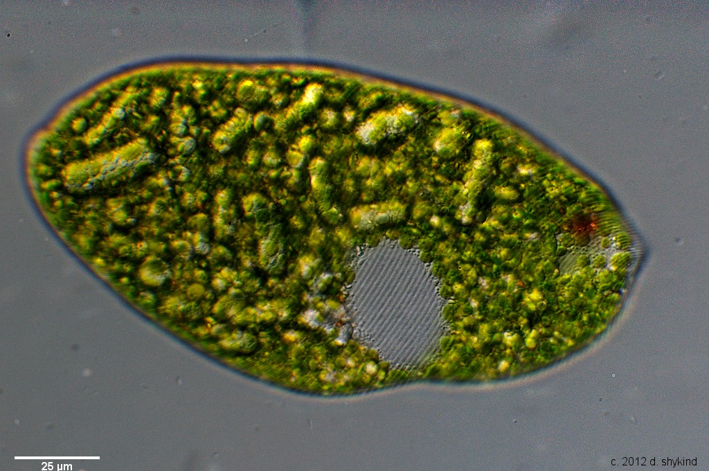 '''유글레나류 신체 구조''' 1: 등쪽 편모, 2: 축사, 3: 파라플라젤라 막대, 4: 마스티고네메 - 편모에 부착된 "털", 5: 편모 주머니 전정, 6: 섭식 장치, 7: 축 방향 팽윤, 8: 눈점 기구 - 빛의 방향과 강도를 감지하는 데 사용되는 광수용체, 9: 수축포 - 세포 내 수분량을 조절, 10: 배쪽 편모, 11: 배쪽 뿌리, 12: 골지체 - 단백질을 변형하고 세포 밖으로 보냄, 13: 소포체 - 특정 세포 부분으로 이동하는 분자를 위한 수송 네트워크, 14: 식포, 15: 리소좀 - 효소를 보유, 16: 핵, 17: , 18: 플라스티드 막 (3, 2차), 19: 틸라코이드 - 광합성의 광의존 반응 부위, 20: 피레노이드 - 탄소 고정의 중심, 21: 파라밀론 과립, 22: 펠리큘러 스트립, 23: 점액체, 24: 미토콘드리아 - 세포를 위한 ATP (에너지) 생성 (원반형 )