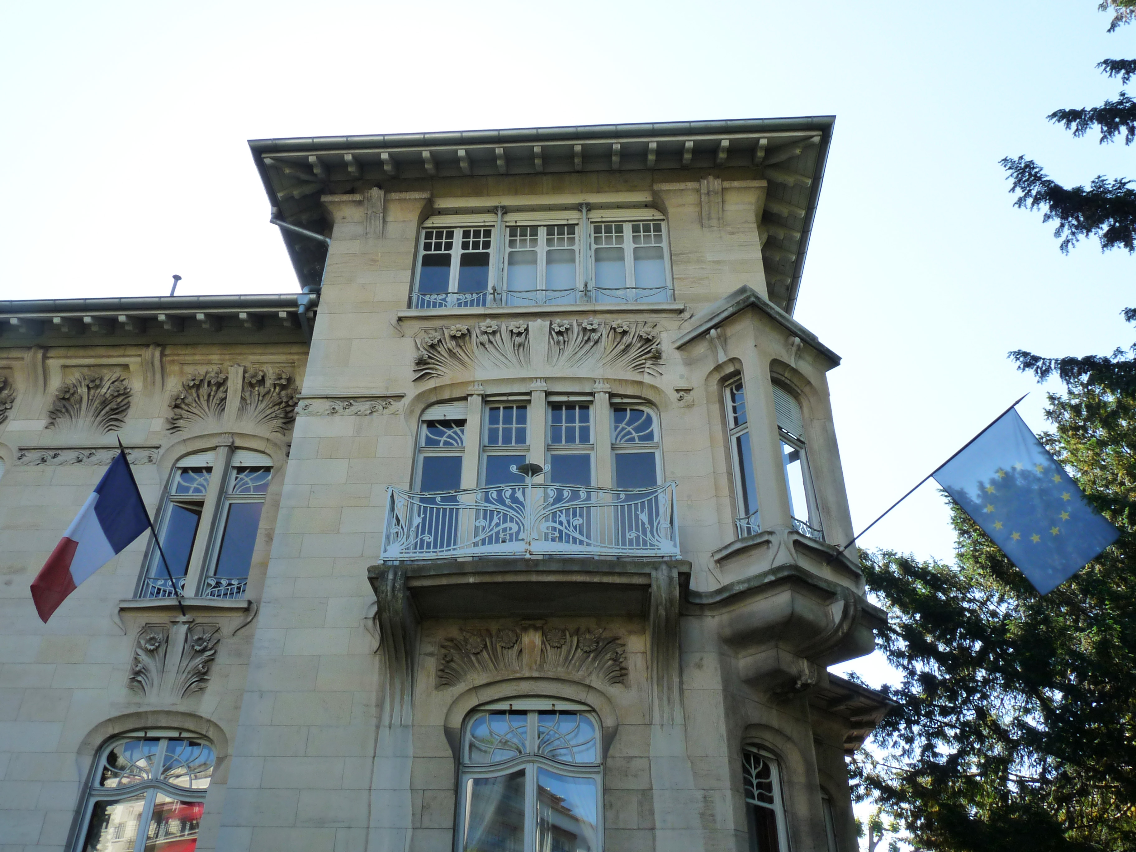 2000년 2월 ''La Raison''에 게시된 기사에서는 1956년 10월 21일 유럽 평의회가 스트라스부르 대성당에 스테인드 글라스 창문을 기증한 것과 더 연결시켰다. 파리 출신 장인 막스 앵그랑의 작품인 이 창문은 짙은 파란색 배경 위에 열두 개의 별이 있는 원 아래에 축복하는 마돈나를 보여준다.[16] 마돈나의 전체적인 디자인은 대성당의 ''Congrégation Mariale des Hommes''의 배너에서 영감을 받았으며, 열두 개의 별은 대성당 내부에서 이 집회가 숭배하는 조각상에서 발견된다(열두는 또한 집회 위원회의 구성원 수이기도 하다).[17] 문화청 지역 사무소는 이 스테인드 글라스 창문을 "Le vitrail de l'Europe de Max Ingrand"(막스 앵그랑의 유럽 스테인드 글라스 창문)이라고 설명한다.[18]