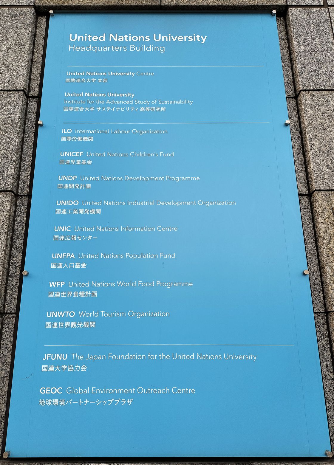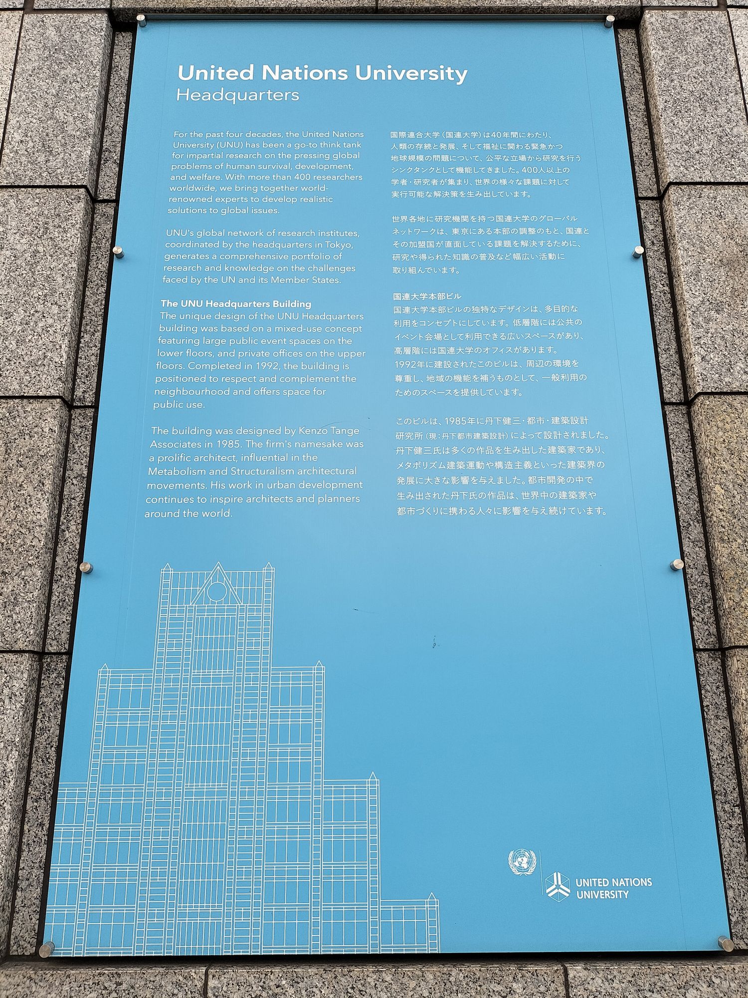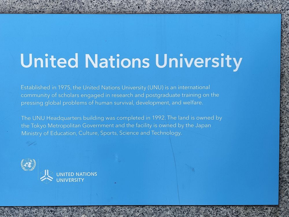 1969년 당시 유엔 사무총장이었던 우 딴은 '완전히 세계적이고, 평화와 번영을 향한 유엔 헌장의 목표를 위해 힘쓸 유엔 대학교의 설립'을 제안했다.[48] 세 차례의 유엔 총회에서 관련 내용을 논의한 끝에 1972년 12월에 유엔 대학교 설립을 의결했다. 일본국 정부가 유엔 대학교 기금으로 1억달러를 내놓을 것을 약속했기 때문에 장소는 도쿄도로 결정됐다.유엔 대학교는 1976년에 일본이 유엔과 대학교 부지 협정을 맺은 뒤에 정식으로 운영됐다.[49]