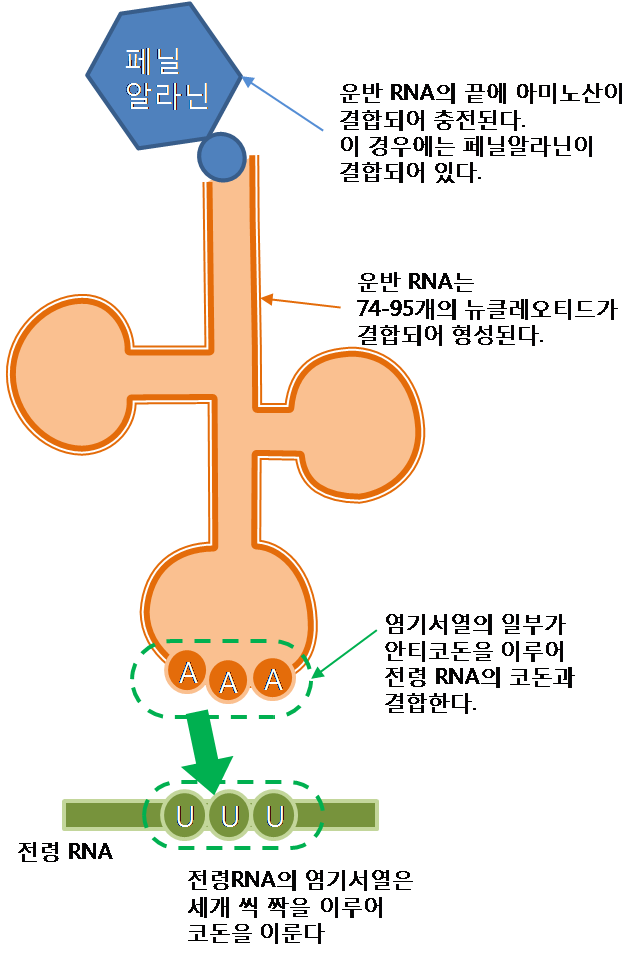 • '''운반''': 아미노산이 충전된 운반 RNA는 리보솜으로 아미노산을 운반한다.
