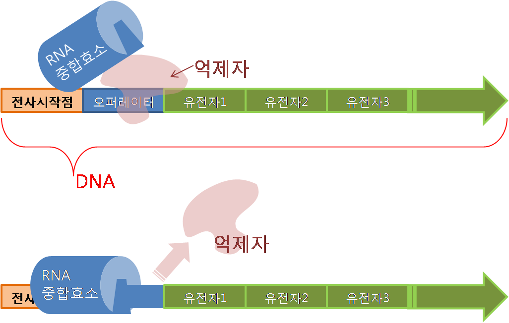 DNA전사하여 전령 RNA를 만드는 RNA 중합효소는 전사를 시작하는 DNA의 특정한 위치인 전사 개시점(프로모터)에 결합되어 전령 RNA를 만든다. 이 과정에서 억제자와 활성자 역할을 하는 효소가 전사를 조절한다.[164]