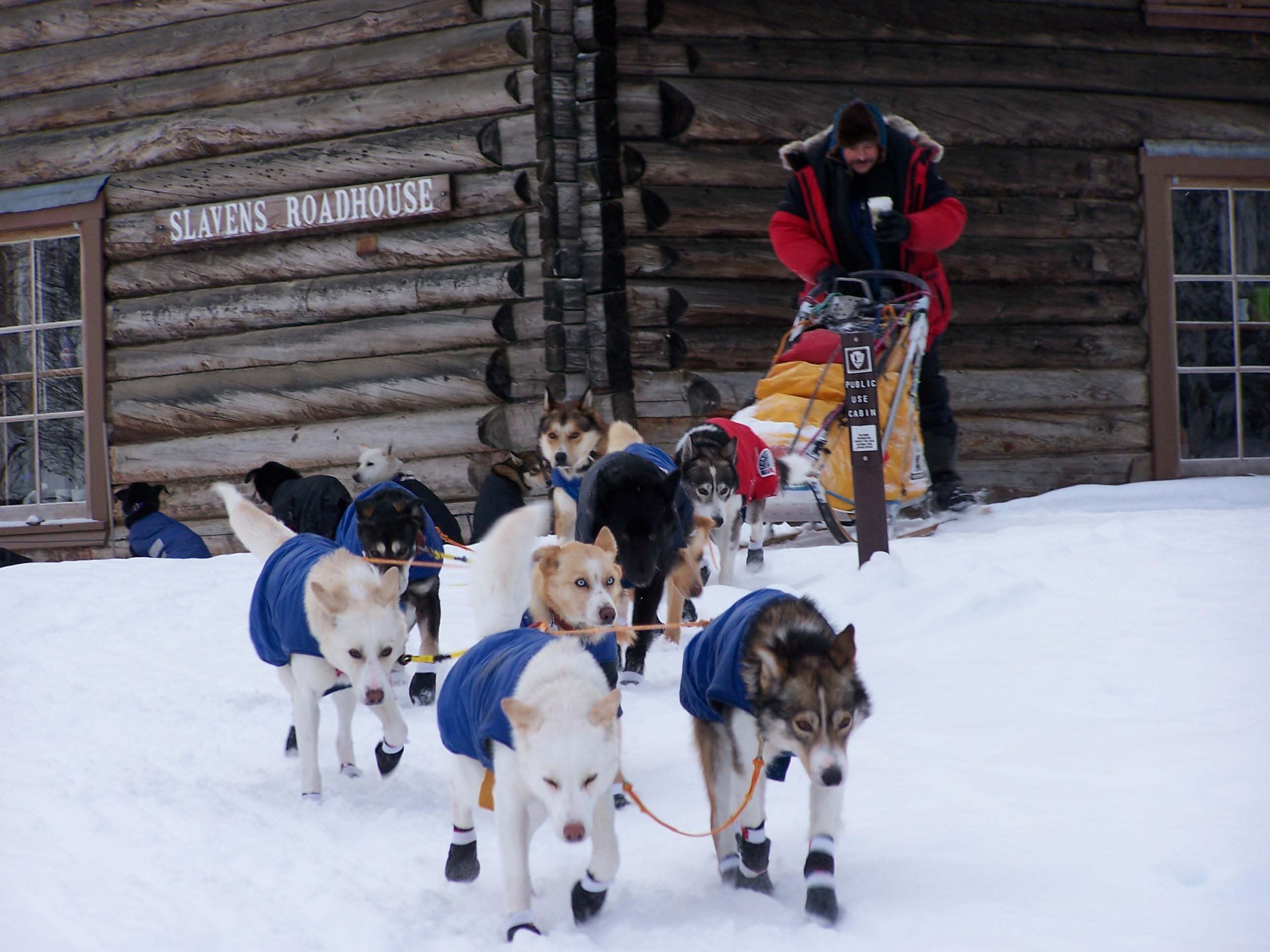 2005년 유콘 퀘스트의 슬라벤 캐빈 체크포인트를 떠나는 팀.