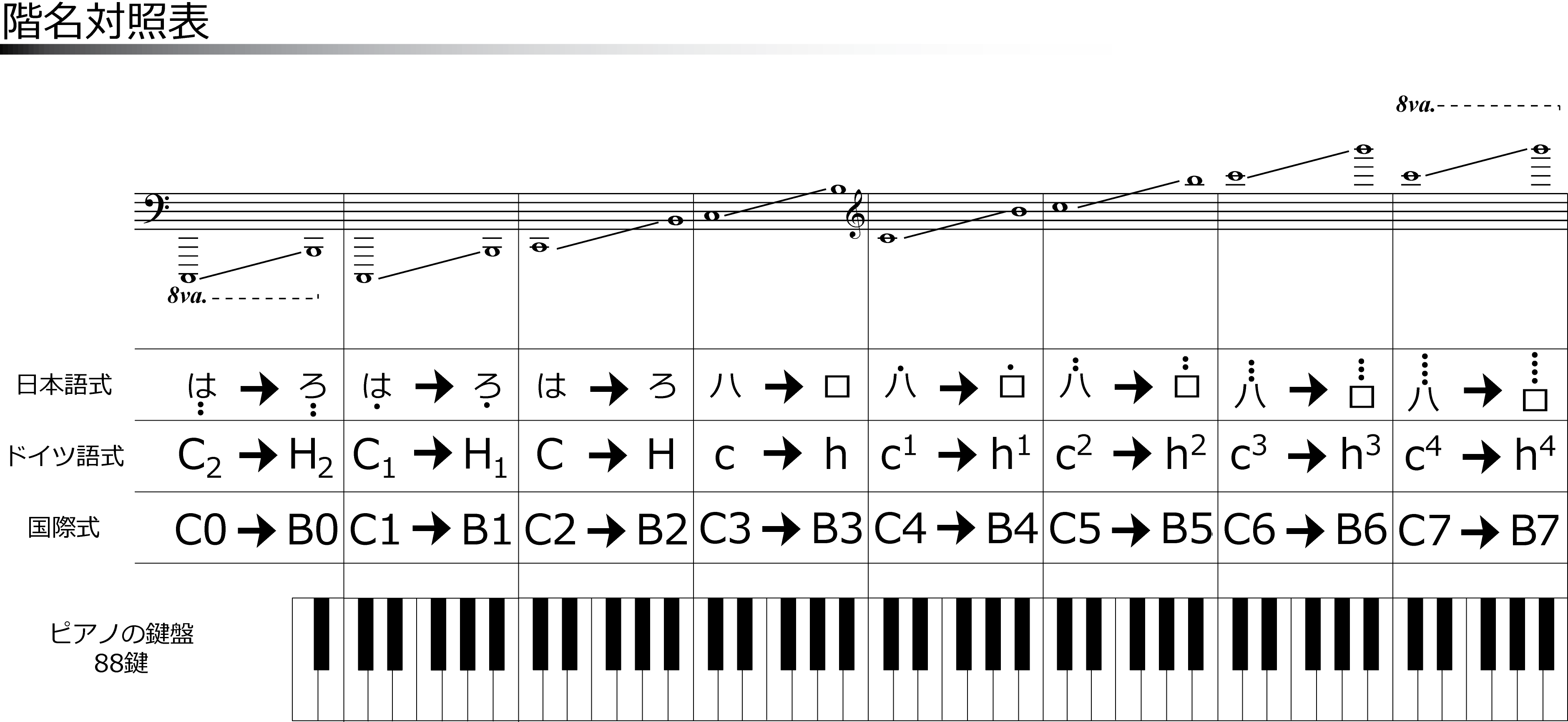 피아노의 88개 건반 중 가장 낮은 음은 헬름홀츠 방식으로는 'A‚‚', 일본식으로는 '하이점 이', 과학적 피치 표기법으로는 'A0'가 된다. 가장 높은 음은 헬름홀츠 방식으로는 'c′′′′′', 일본식으로는 '오점 하', 과학적 피치 표기법으로는 'C8'이 된다.