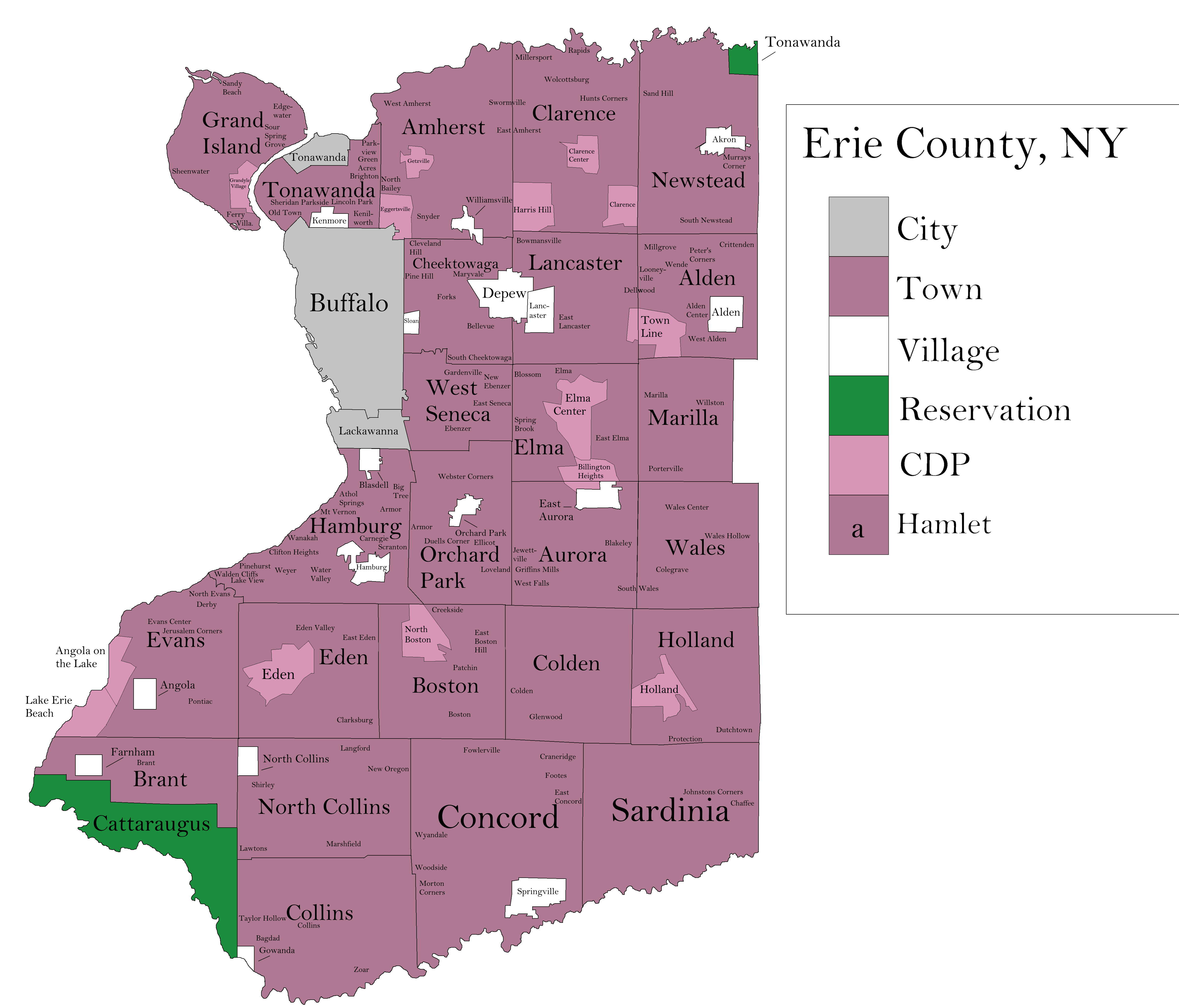 인구가 증가함에 따라, 주 의회는 1802년에 온타리오 카운티의 일부를 분리하여 제네시 카운티를 만들었다. 1808년에는 제네시 카운티에서 나이아가라 카운티가 만들어졌다. 1821년에는 토나완다 크릭과 카타라우구스 크릭 사이의 모든 토지를 포함하여 나이아가라 카운티에서 이리군이 만들어졌다.[7]