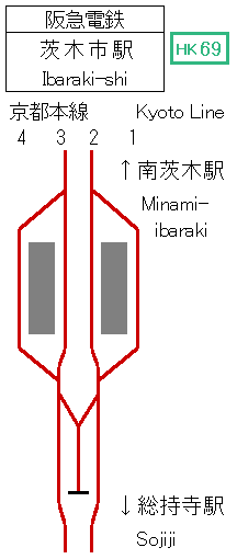 준급미나미이바라키 (HK-68) (우메다 방면)다카쓰키시 (HK-72) (가와라마치 방면) 보통미나미이바라키 (HK-68) (우메다 방면)소지지 (HK-70) (가와라마치 방면)