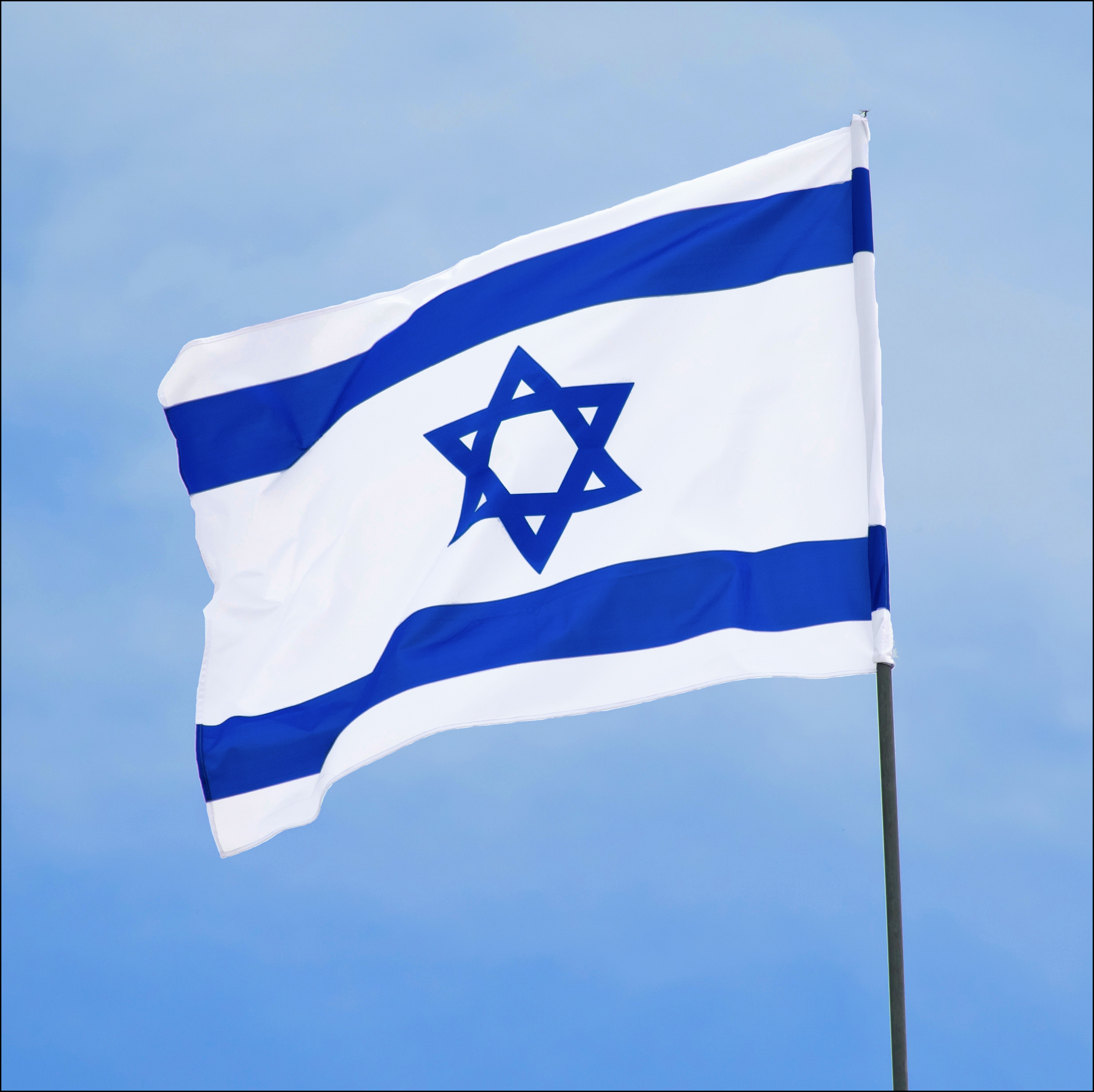이스라엘 국기는 흰색 바탕에 위아래로 짙은 하늘색 가로 줄무늬가 두 개 있고, 중앙에 다윗의 별(육망성)이 있는 형태이다.