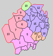 - 이스미시: 지마치촌, 후루사와촌, 나카가와촌, 아즈마촌, 나미하나촌, 구니요시촌, 나카이오치촌, 도카이촌, 아사히정, 나카네촌