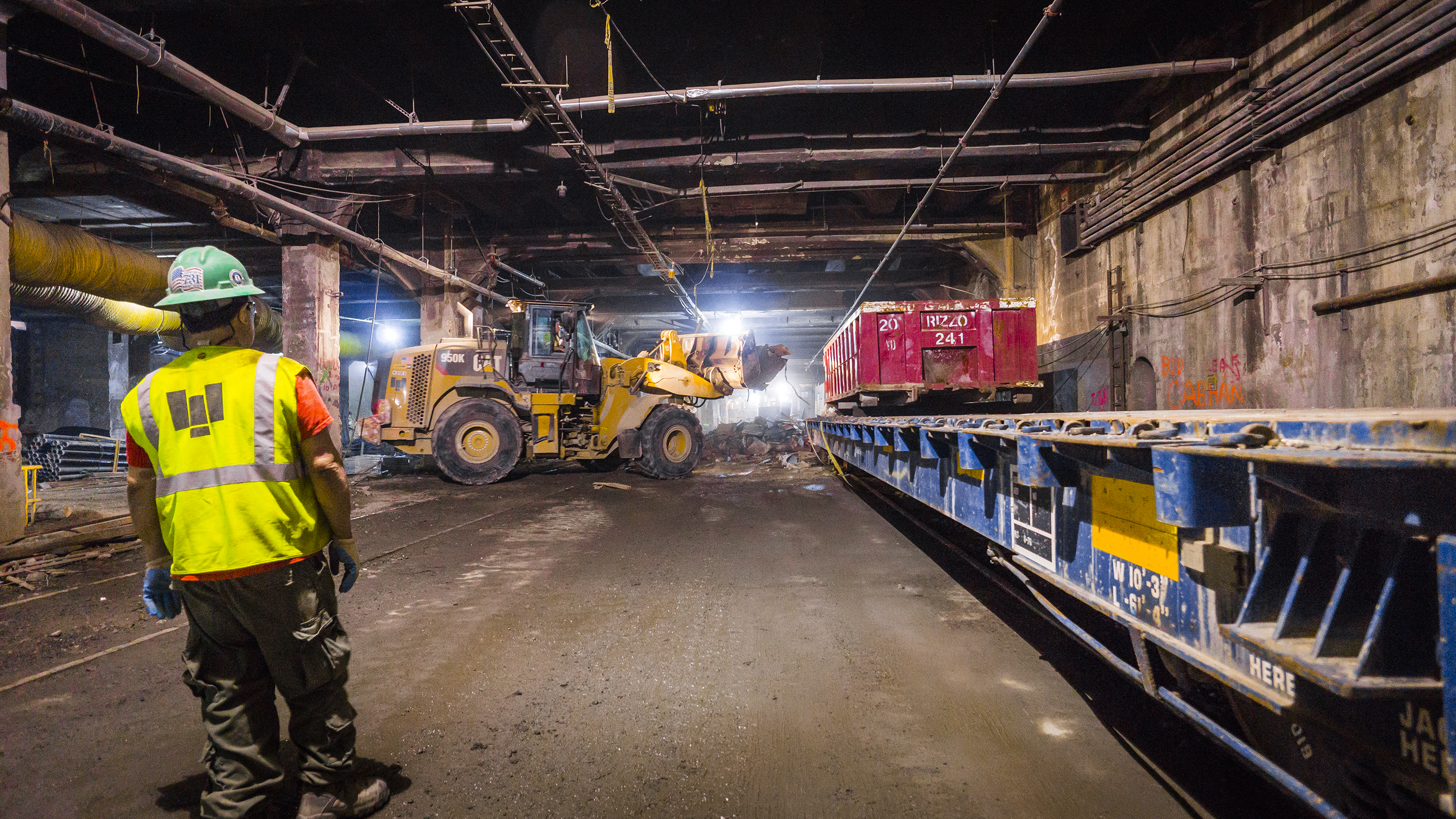2014년 5월 그랜드 센트럴 터미널의 매디슨 야드에서 역의 상부 통로 건설. 건설 중 장비를 반입하고 잔해를 제거하기 위해 야드의 두 개 선로가 계속 사용되었습니다.