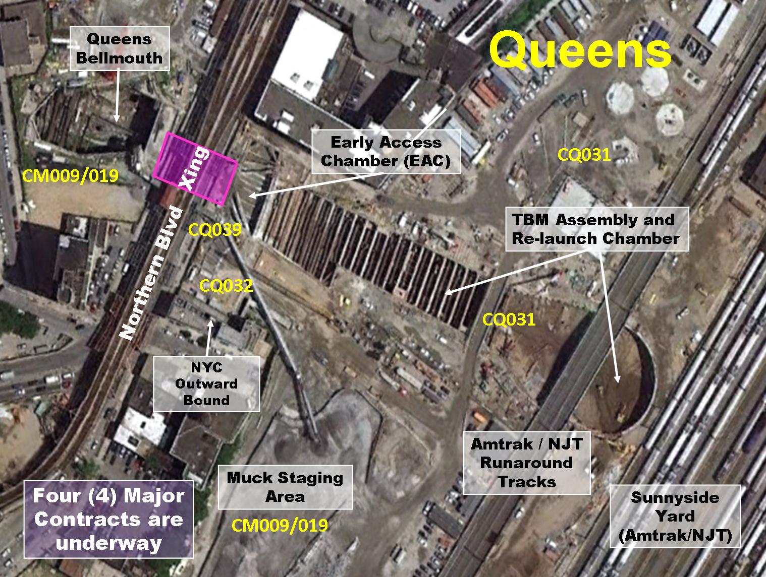 2018년 7월, 작업자들은 당시 진행되지 않은 마지막 주요 계약인 퀸스 터널 포털 건설을 위해 트랙을 재정렬하기 시작했다.[75] 세 개의 서행 메인 선 및 포트 워싱턴 지선 트랙을 재정렬하고 기존 트랙을 대체하기 위해 새로운 동행 메인 선 트랙을 건설하는 작업은 2018년 여름 말까지 완료되었다.[57] 마지막 주요 건설 계약(해롤드 인터로킹의 트랙을 이동하고 터널 B/C를 위한 터널 포털 구조물을 건설하는 6000만달러)은 2018년 10월 Skanska에 체결되었다.[76][77] 터널 구조물 작업은 2019년 중반부터 2021년 중반까지 진행될 것으로 예상되었다.[78][79] 미드데이 저장 야드 작업도 진행되었으며, 2019년까지는 저장 야드에 트랙이 부설되었다.[59] 터널 B/C의 포털은 2021년 초에 완료되었고,[80] 야드는 그해 5월까지 99% 완료되었다.[81]