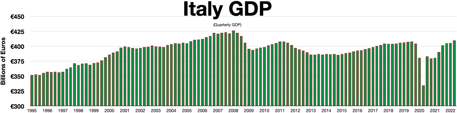글로벌 경기 침체의 영향으로 1990년대에 이미 진행 중이던 긴축 경제 정책은 더욱 악화되었다.[83] 1990년대 말 짧은 회복기를 거쳤지만, 높은 세율과 관료주의는 2000년부터 2008년까지 이탈리아 경제를 정체시켰다.[84][85]