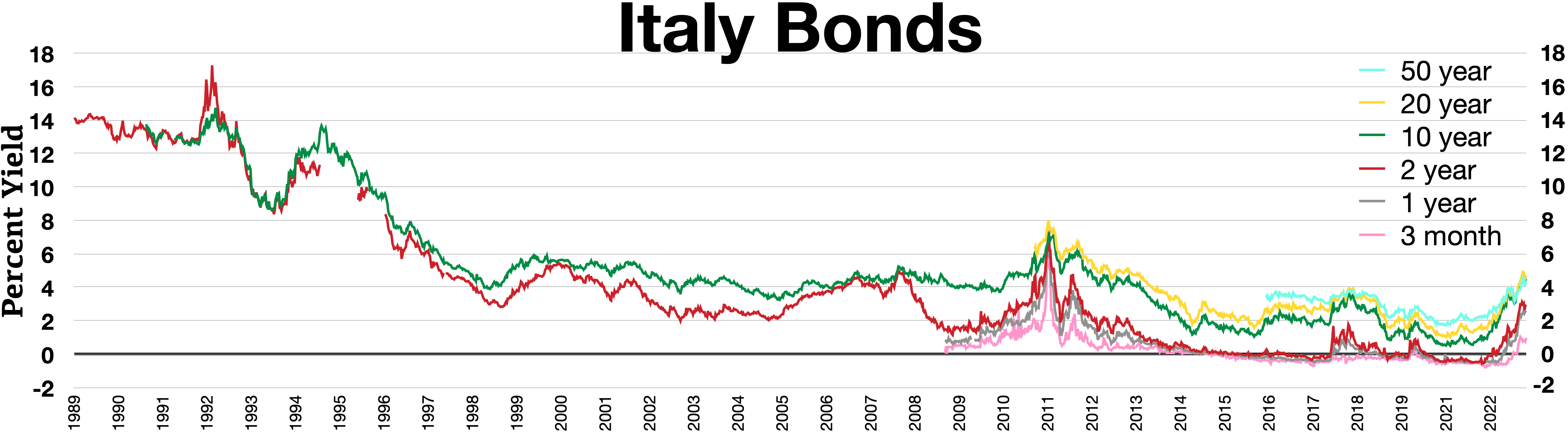 이탈리아는 2008~2009년의 대침체와 그 이후의 유럽 부채 위기로 가장 큰 타격을 입은 국가 중 하나였다. 국가 경제는 전체 기간 동안 6.76% 감소했으며, 총 7분기 동안의 경기 침체를 기록했다.[86] 2011년 11월 이탈리아 국채 금리는 10년 만기 채권 기준으로 6.74%였으며, 이는 이탈리아가 금융 시장 접근성을 잃을 것으로 예상되는 7% 수준에 근접했다.[87] 유로스타트(Eurostat)에 따르면 2015년 이탈리아 정부 부채는 GDP의 128%로 그리스 (175%) 다음으로 두 번째로 높은 부채 비율을 기록했다.[88] 그러나 이탈리아 공공 부채의 가장 큰 부분은 이탈리아 국민이 소유하고 있으며, 비교적 높은 수준의 민간 저축과 낮은 수준의 민간 부채는 유럽의 어려움을 겪는 경제 중 가장 안전하다고 여겨지게 만들었다.[89][90] 부채 위기를 피하고 성장을 촉진하기 위한 충격 요법으로, 마리오 몬티가 이끄는 국민 연합 정부는 대규모 긴축 정책 프로그램을 시작했으며, 이는 적자를 줄였지만 2012년과 2013년에 국가를 이중 침체로 몰아넣어 많은 경제학자들로부터 비판을 받았다.[91][92]
