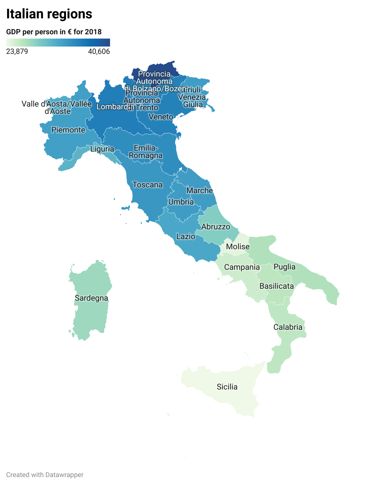 2020년 2월부터 이탈리아는 코로나19 범유행의 심각한 영향을 받은 유럽 최초의 국가가 되었고,[94] 이는 결국 전 세계로 확산되었다. 이탈리아 경제는 국가 경제 활동의 대부분을 봉쇄한 결과로 엄청난 충격을 받았다. 3개월 후인 2020년 5월 말에 팬데믹이 통제되었고, 경제, 특히 제조업 부문이 회복되기 시작했다. 전반적으로 GDP가 대부분의 서방 국가와 마찬가지로 급락했음에도 불구하고 놀랍도록 회복력을 유지했다.[95][96]