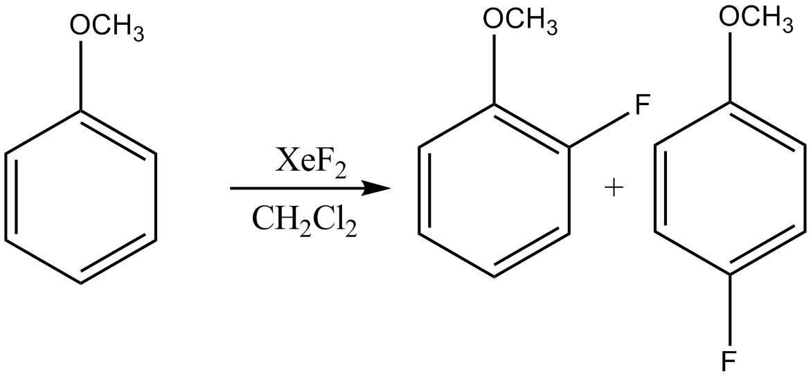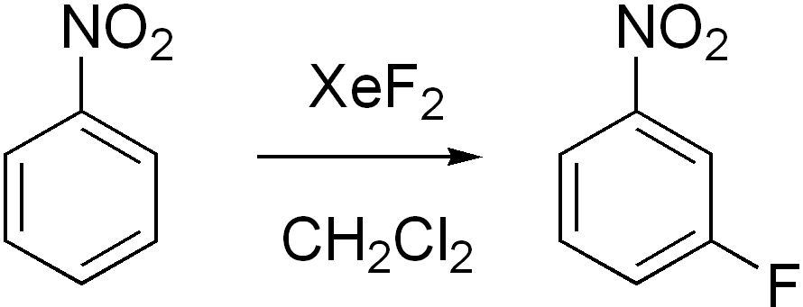 이플루오린화 제논은 유기 화합물 및 무기 화합물의 선택적 플루오린화에 사용되는 강력한 플루오린화 및 산화제이다.[26][27] 불소 이온 수용체와 함께 사용하면 더욱 강력한 플루오린화제인 XeF+ 및 Xe2F3+ 종을 형성한다.[17]이플루오린화 제논이 관여하는 플루오린화 반응에는 다음과 같은 것들이 있다.