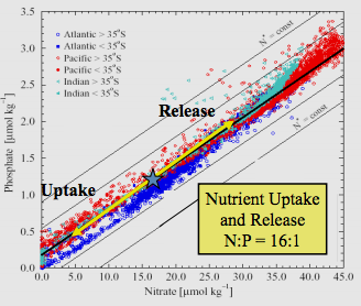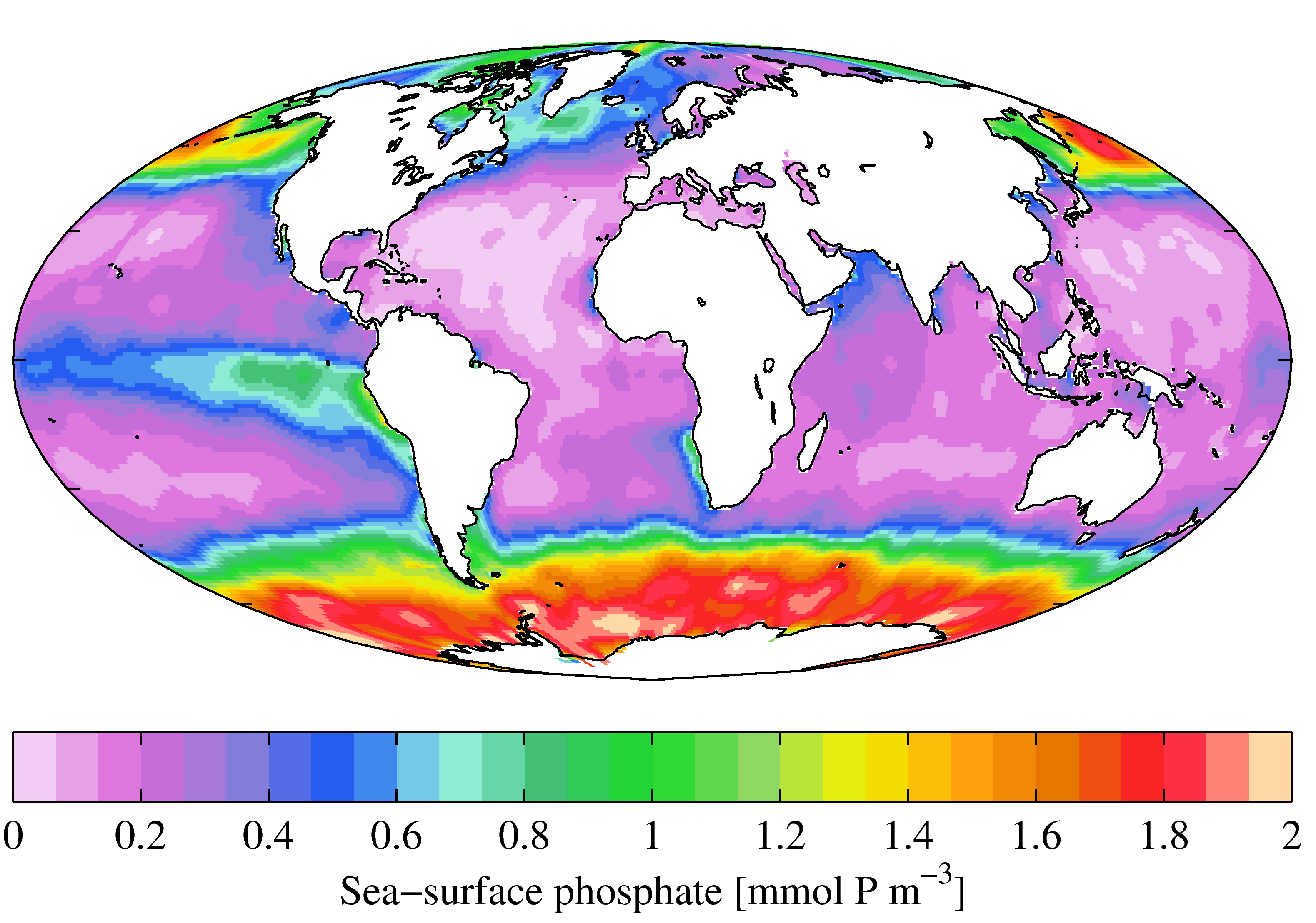 해양 생태계에서는 태양 에너지가 풍부한 표층 해수에 오히려 인산염이 부족한 경우가 많다. 생물이 흡수한 인은 생물이 죽은 뒤 사체가 가라앉으면서 해저로 이동하기 때문이다. 따라서 인산염은 주로 깊은 바다에 풍부하게 존재하며, 표층으로 인산염이 공급되는 것은 육지로부터의 유입이나 해저에서 솟아오르는 용승 등 제한적인 경로를 통해서이다. 이러한 인산염 공급이 원활한 지역에서 활발한 생물 생산이 이루어진다.