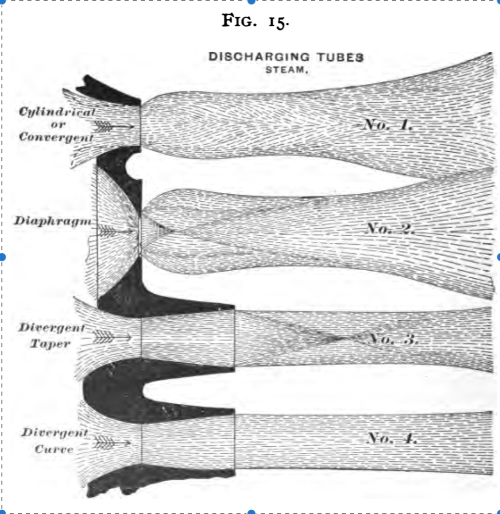 그림 15는 Kneass가 노즐을 통과하는 증기에 대해 그린 네 개의 스케치를 보여준다. 일반적으로, 압축성 유동은 가스가 팽창함에 따라 넓어지는 관(발산 덕트)을 통과하면서 속도가 증가한다. 그림 15의 아래쪽 두 스케치는 모두 넓어지는 형태지만, 맨 아래 스케치는 약간 곡선형이며 축과 평행하게 가장 빠르게 흐르는 흐름을 만들어냈다. 관의 단면적은 지름의 제곱에 비례하며, 곡률은 증기가 관을 통과하면서 더 선형적으로 팽창하도록 한다.