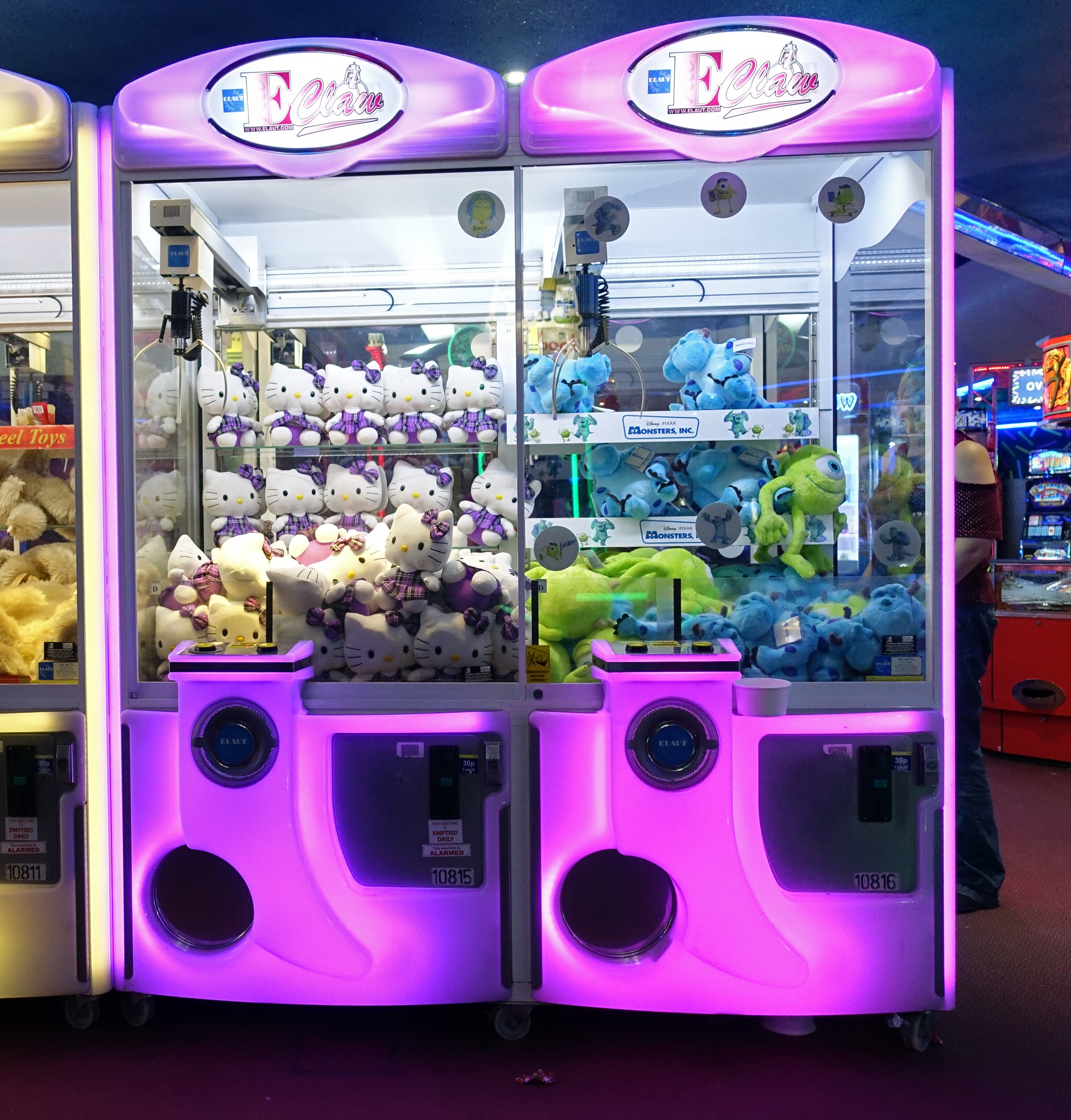 인형뽑기는 일정 금액을 지불하고 경품을 획득하는 아케이드 게임이다. 한국에서는 경품 가격을 5천 원 이하로 한정하고 있지만,[88] 실제로는 5천 원이 넘는 고가 인형이 경품으로 사용되는 경우가 많다. 또한, 인형뽑기 기계의 힘을 의도적으로 조정하여, 일정 금액이 투입되어야만 정상 작동하도록 조작하는 경우도 있어 사용자들이 중독에 빠지기 쉽다.[89]경품 가격이 5천 원을 초과하면 불법이기 때문에, 업주들은 정품이 아닌 가품 인형을 사용하는 경우가 많다. 이는 캐릭터 산업에 악영향을 미치지만, 한편으로는 정부의 규제가 업주들에게 딜레마를 야기한다는 지적도 있다.[90]