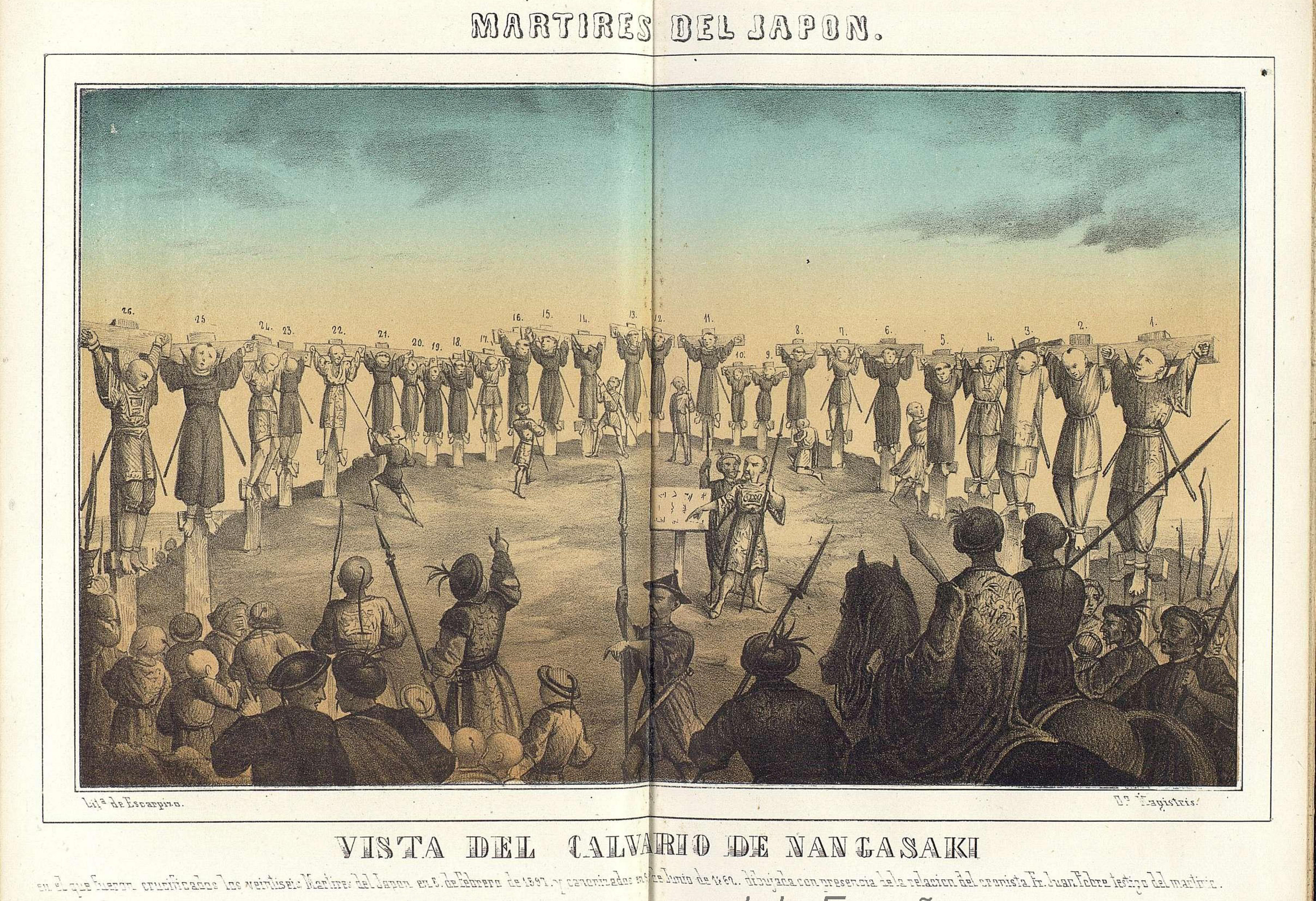 1596년 산 펠리페호 사건 이후, 1597년 도요토미 히데요시의 명령으로 26명의 가톨릭 신자가 체포되었다. 이들은 4명의 스페인인, 1명의 멕시코인, 1명의 인도 포르투갈인 (프란치스코회 선교사), 3명의 일본인 예수회 신부, 그리고 17명의 일본인 성 프란치스코 3회 회원이었다. 선교 신부들의 복사로 봉사했던 3명의 어린 소년도 포함되었다. 이들은 고문을 받고 신체가 훼손된 채 일본 전역의 마을을 끌려다녔으며, 1597년 2월 5일 나가사키 시를 내려다보는 언덕에서 십자가에 못 박히고 창으로 찔려 순교했다.[4][5]