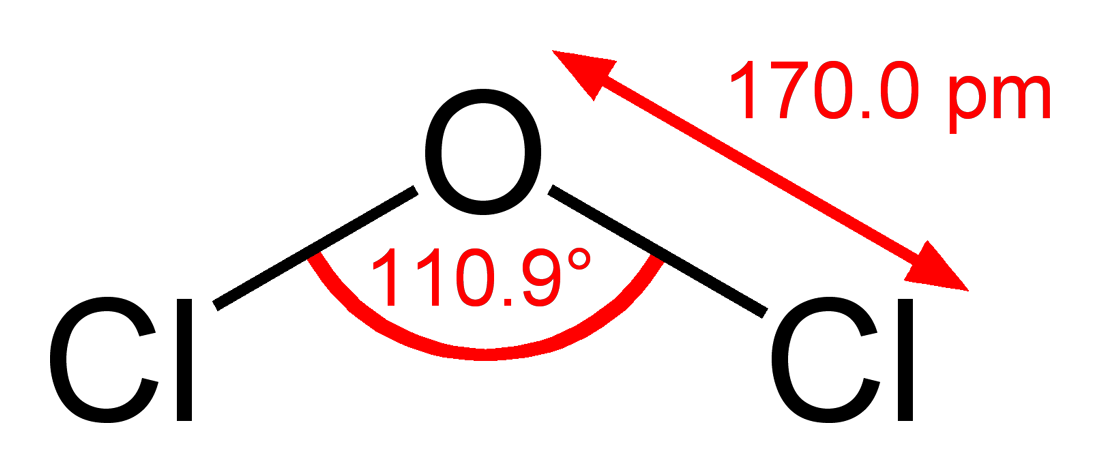 일산화 이염소는 상온에서 황색의 자극적인 냄새를 가진 기체 형태로 존재한다. 녹는점은 -120.6°C, 끓는점은 22.0°C이다. 공기에 대한 비중은 22.0°C에서 3.02이다. 용해열은 36.6kJ/mole, 증발열은 26kJ/mole이다. 물에 녹는다. 염소 원자와 산소 원자의 결합 길이는 1.701±0.020Å, 결합각은 110.8±1°, 염소 원자 간의 거리는 2.791±0.020Å이다.3. 2. 분자 구조