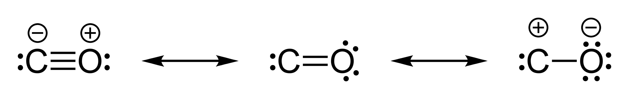 일산화 탄소는 위와 같은 3개의 공명 구조를 갖는다. 전기 음성도는 산소가 탄소보다 크지만, 삼중 결합성이 강하여 탄소 원자에 음전하가 실린 왼쪽 구조의 기여가 크다.[100] 전자는 탄소 쪽에 더 쏠려있어 쌍극자 모멘트는 0.122 D이다.[99] σ 궤도는 71%, π 궤도는 77% 산소 원자 쪽에 분극되어 있다.[100] 바닥 상태에서는 일중항 상태이므로 짝을 이루지 않는 전자는 없다.[101]