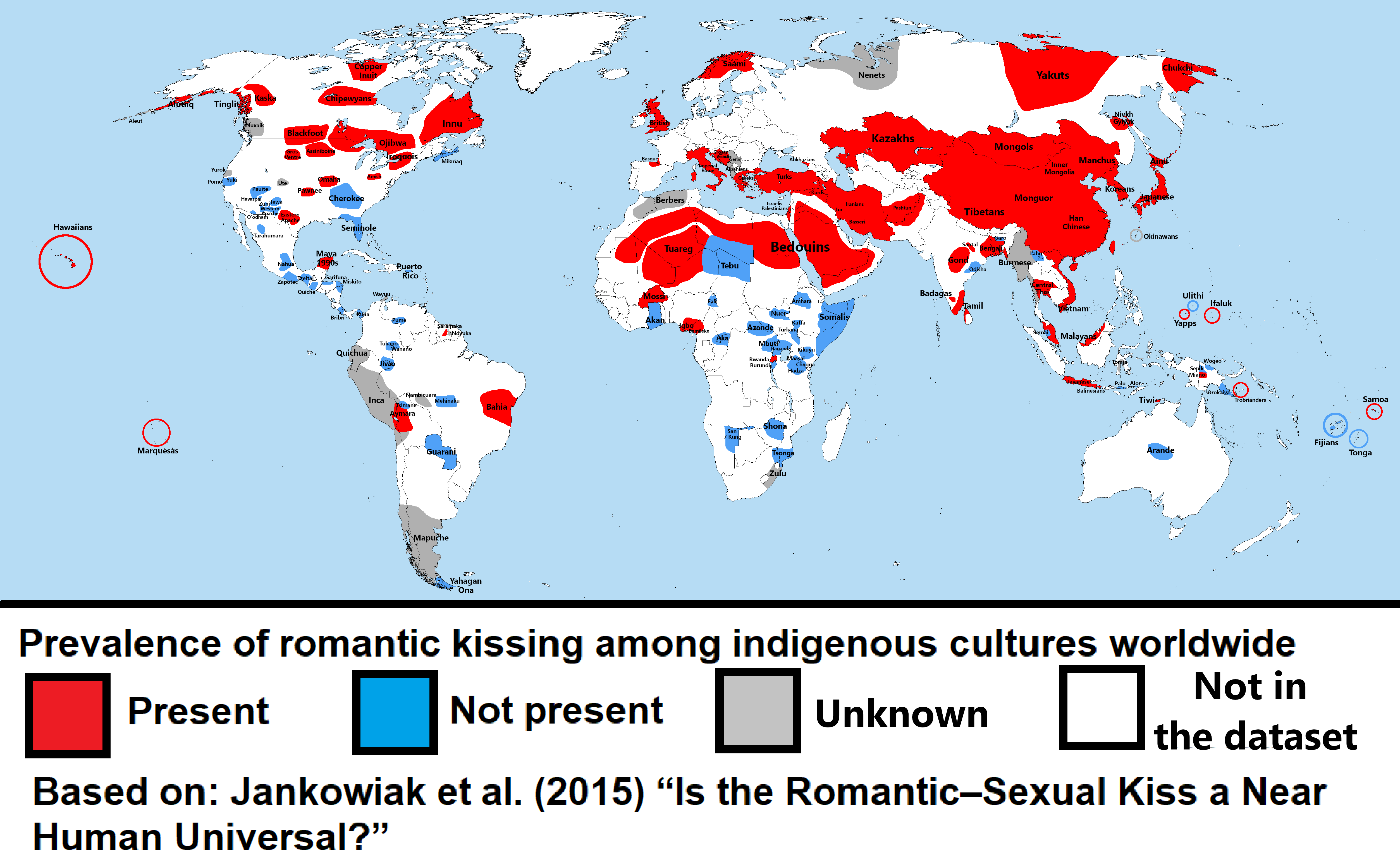 도널드 리치는 일본과 중국에서 키스가 에로틱한 상황에서 이루어졌지만, 공개적인 장소에서는 "키스가 보이지 않았으며", "입술을 맞대는 행위는 오랫동안 유럽과 미국에서 문화적으로 규정된 행동이 되지 않았다"고 언급했다. 초기 에디슨 영화인 ''과부 존스 – 메이 어윈-존 라이스 키스''(1896)는 도쿄에서 상영되었을 때 큰 반향을 일으켰고, 사람들은 그 장면에 몰려들었다. 마찬가지로, 로댕의 조각 ''키스''는 태평양 전쟁 이후에야 일본에서 전시되었다.[41] 1900년대 만주 부족들은 아무르강을 따라 성인 간의 공개적인 키스에 혐오감을 느꼈고,[42] 중국 전통에서도 비슷한 상황이 있어, 중국 남성들은 서양 여성들이 공개적인 장소에서 남성과 키스하는 것을 보고 그 여성을 매춘부로 생각했다.[43]