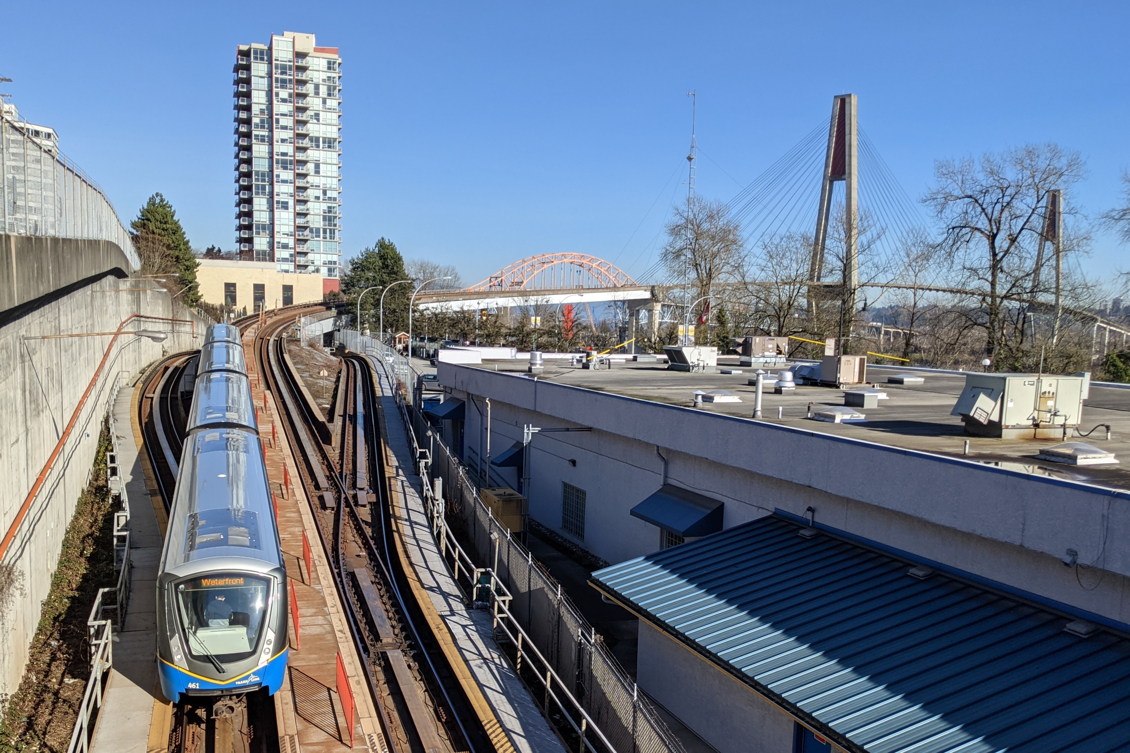 - 컬럼비아 역 (뉴 웨스트민스터) – 엑스포 라인이 킹 조지 (상단) 및 프로덕션 웨이–유니버시티 (하단)로 분기된다.[1]