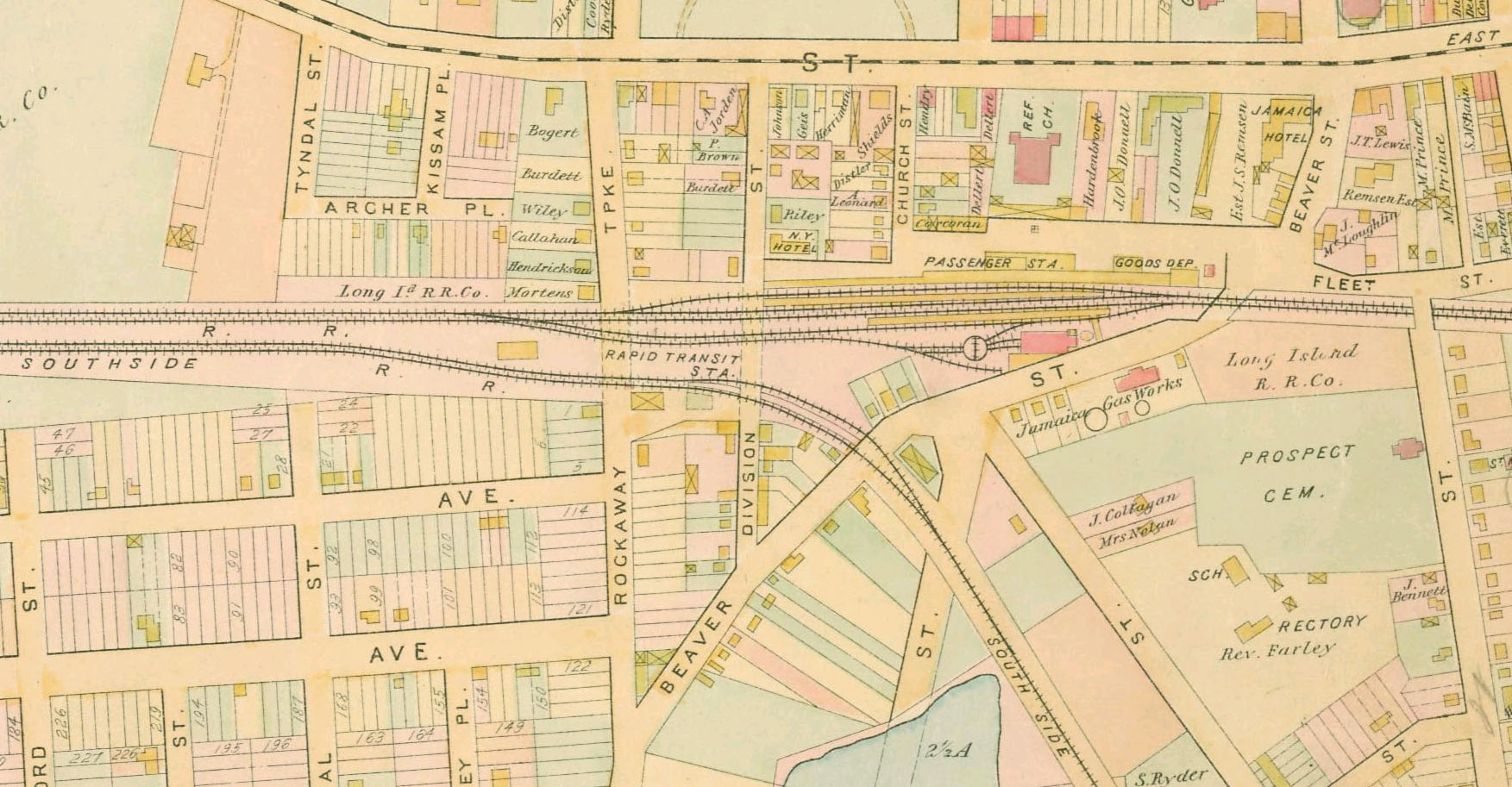 롱아일랜드 사우스 사이드 철도는 애틀랜틱 지선에 '''자메이카-비버 스트리트''' 역을 건설했다. 1867년 10월 28일에 개통되었으나 1871년에 철거되었고, 같은 해 크리스마스에 대체되었다. LIRR이 1867년에 SSRRLI를 인수하면서 역은 비버 스트리트 건널목 남쪽으로 옮겨져 짧은 선로에 위치했다.[9] 이 시기의 시간표에는 로커스트 애비뉴로 가는 애틀랜틱 지선 열차의 역 정차역으로 "자메이카"로 표시되었다.[9] 1908년에서 1913년 사이에는 역 정차역이 "자메이카 (비버 스트리트)"로 표기되었다.[9]