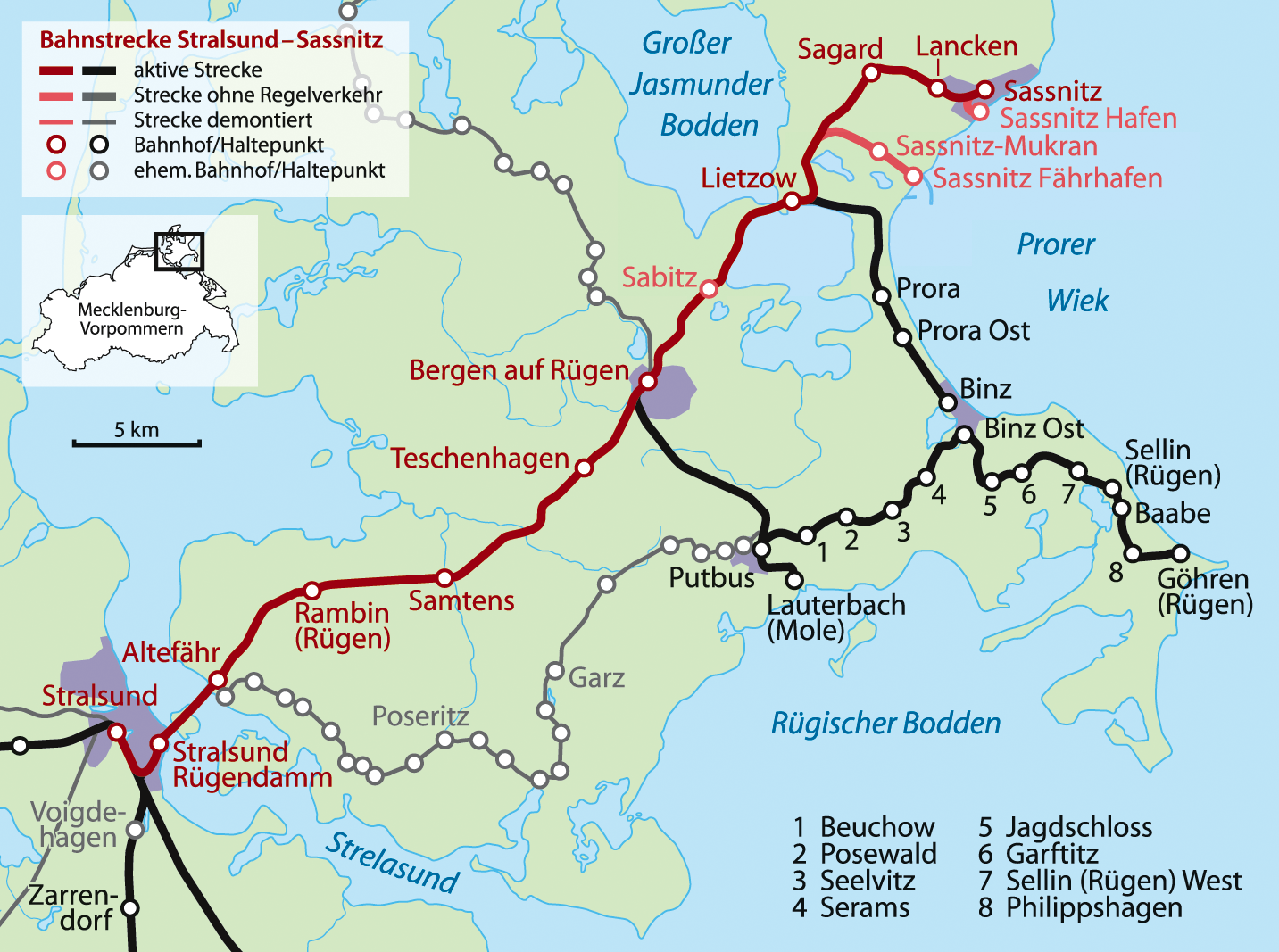 자스니츠역 외에도 무크란에는 페리 터미널이 있다. 제1차 세계 대전 이전에도, 자스니츠에는 독일에서 스웨덴(트렐레보리)으로 가는 이른바 왕의 노선을 위한 페리 터미널로서 자스니츠 항구역이 설립되었다. 1980년대에는 무크란 지구에 러시아 광궤와 표준궤 철로가 갖춰진 새로운 페리 터미널이 건설되었다. 무크란에서 리투아니아 클라이페다, 보른홀름[11] 및 상트페테르부르크로 오가는 열차 페리가 있다. 스웨덴행 페리에는 도로 차량 외에 철도 차량도 운송된다. 2004년에는 침대차와 쿠셋 차가 있는 베를린-말뫼 야간 열차 외에도 약 60,000대의 화차가 있었다.1984년에는 노이 무크란과 클라이페다 간에 새로운 페리 서비스가 시작되어, 폴란드를 우회하는 소련과 독일 민주 공화국 간의 노선을 제공했다. 이 서비스에는 5개의 병렬 러시아 1520mm 궤도 트랙이 장착된 철도 페리가 갖춰졌다. 화차는 노이 무크란의 광대한 철도 야드에서 대차를 교체하거나 하역되었다. 이 연결은 폴란드가 정치적으로 덜 지원적이 되었고 통행료를 4배로 인상하려던 시기에 독일에 주둔한 러시아 군대의 공급을 완화했다. 아이러니하게도 1994년에는 이 페리가 러시아의 핵미사일을 독일에서 수송하는 데 사용되었다.