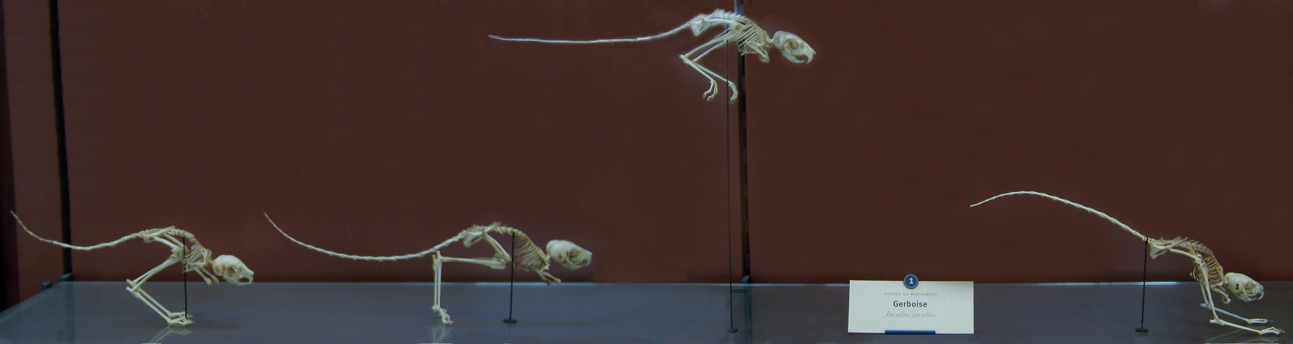 더 작은 이집트뛰는쥐는 모래 또는 바위가 많은 사막 지역에 서식한다. 파리 국립 자연사 박물관에 전시된 표본은 점프 동작의 순서를 보여주는 골격 모습을 보여준다.