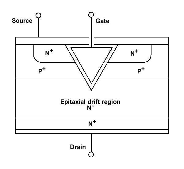 가장 널리 사용되는 구조는 VDMOS (수직 확산 MOS) 구조이다. VDMOS의 단면도 (그림 1)를 보면 소스 전극이 드레인 위에 위치하여 전류가 주로 수직으로 흐른다. 여기서 '확산'은 제조 공정을 의미하며, P 우물은 확산 공정을 통해 얻어진다. 특히, P 영역과 N+ 영역을 얻기 위해 이중 확산 공정을 거치므로 DMOS (이중 확산 MOS)라고도 불린다.[14][15]