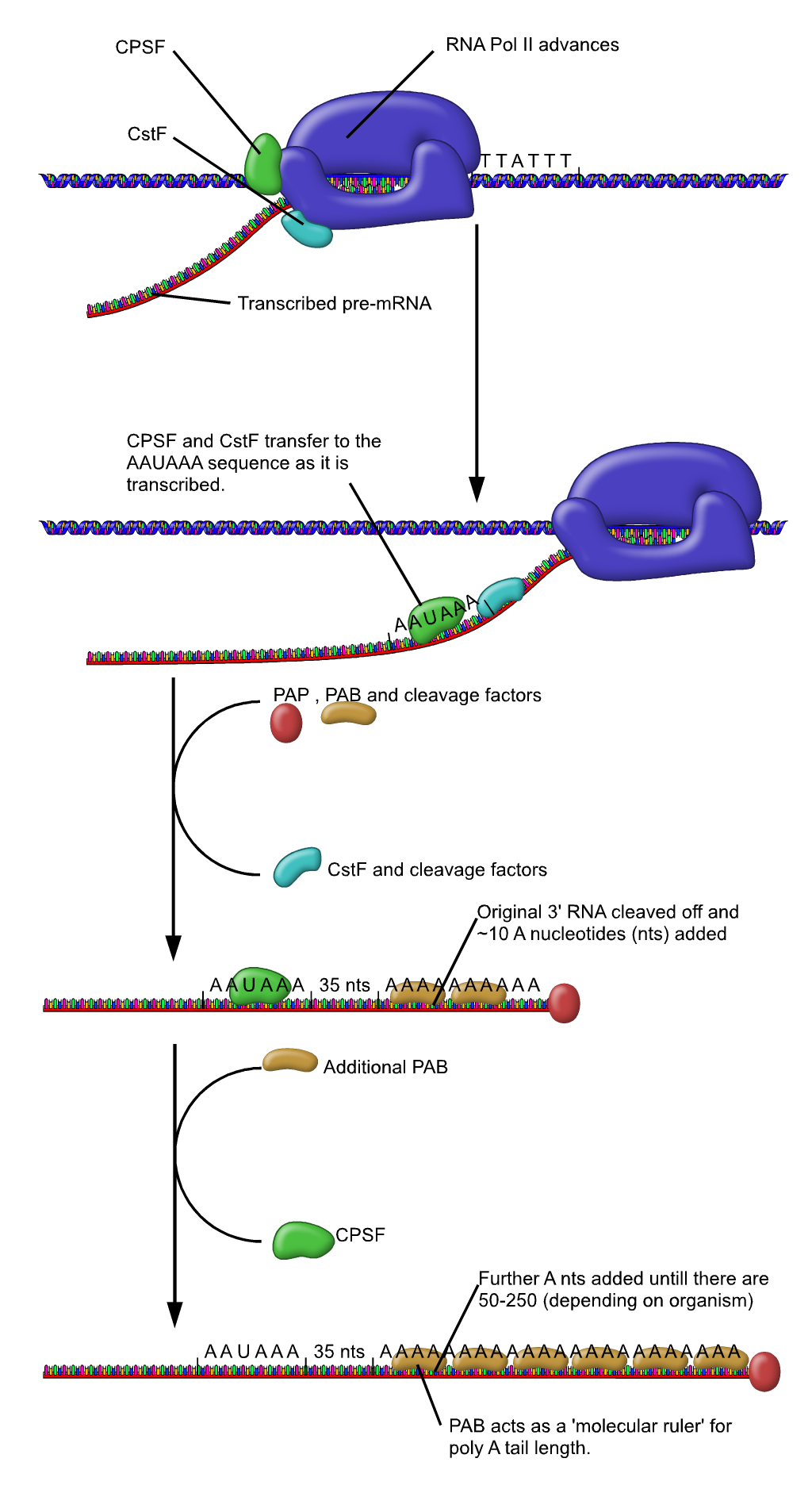 폴리아데닐화는 DNA에서 RNA로 전사될 때 및 (또는) 그 직후에 일어난다. 전사가 종료되면, RNA 중합효소에 결합하는 엔도뉴클레아제 복합체의 작용에 의해 mRNA 가닥이 절단된다. mRNA가 절단된 후, 절단 부위의 유리 3' 말단에 약 250개의 아데노신 잔기가 부가된다. 이 반응은 폴리아데닐산 중합효소에 의해 촉매된다. 선택적 스플라이싱과 마찬가지로 하나의 mRNA에 여러 종류의 폴리아데닐화 변이체가 존재할 수 있다.