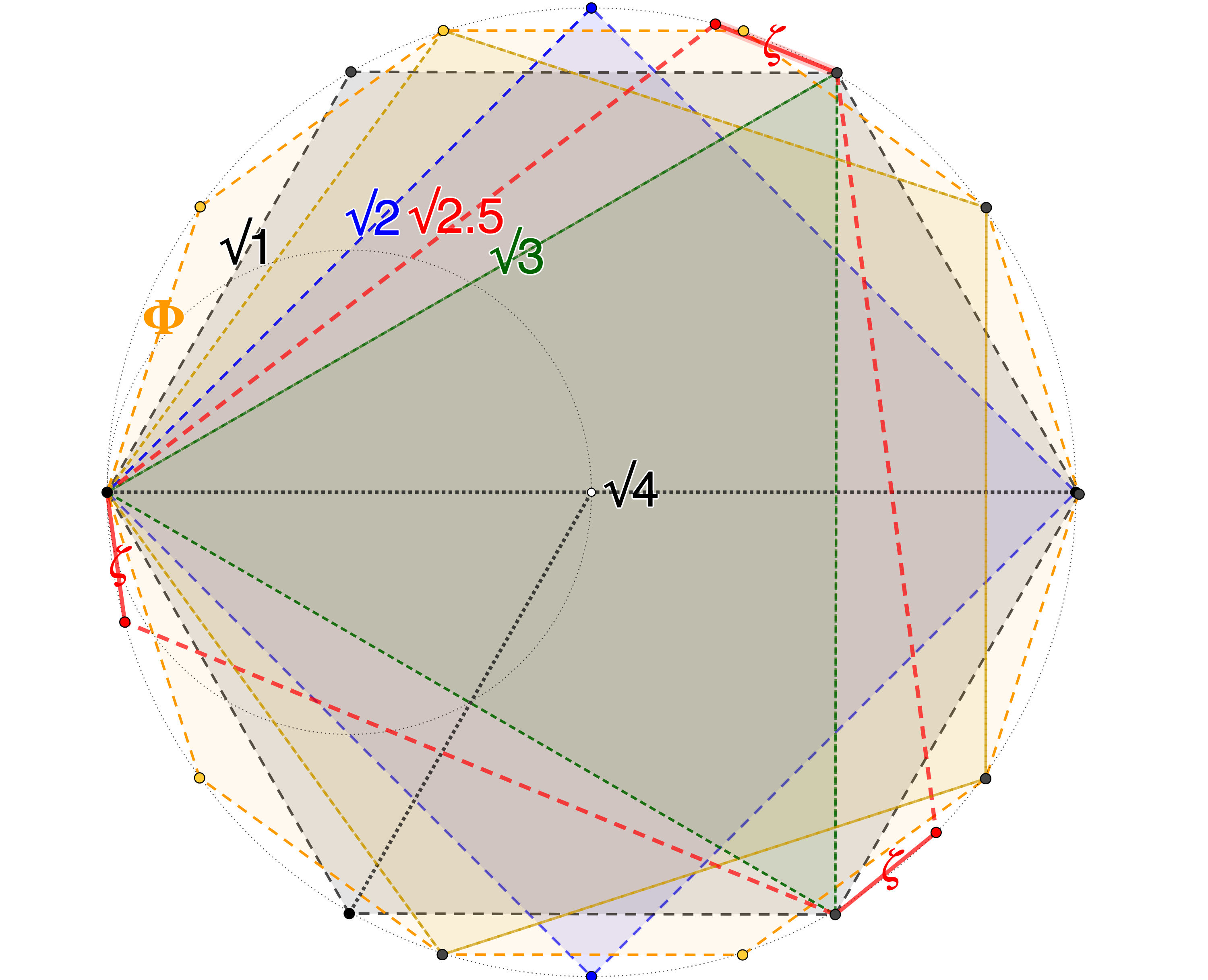 이전 도형의 인스턴스에서 각각을 구성하는 역방향 절차는 이전 도형의 반지름을 보존하지만 일반적으로 더 작은 모서리 길이를 가진 후속 도형을 생성한다. 600-포체의 모서리 길이는 반지름의 약 ~0.618배(역 황금비)이지만, 120-포체의 모서리 길이는 반지름의 약 ~0.270배이다.