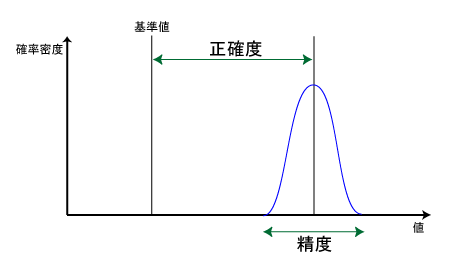 동일한 양을 반복 측정하여 얻은 통계적 표본이나 데이터 집합이 있을 때, 그 평균값이 측정하려는 양의 실제 값에 가까우면 '''정확하다'''고 하며, 표준 편차가 비교적 작으면 '''정밀하다'''고 할 수 있다.
