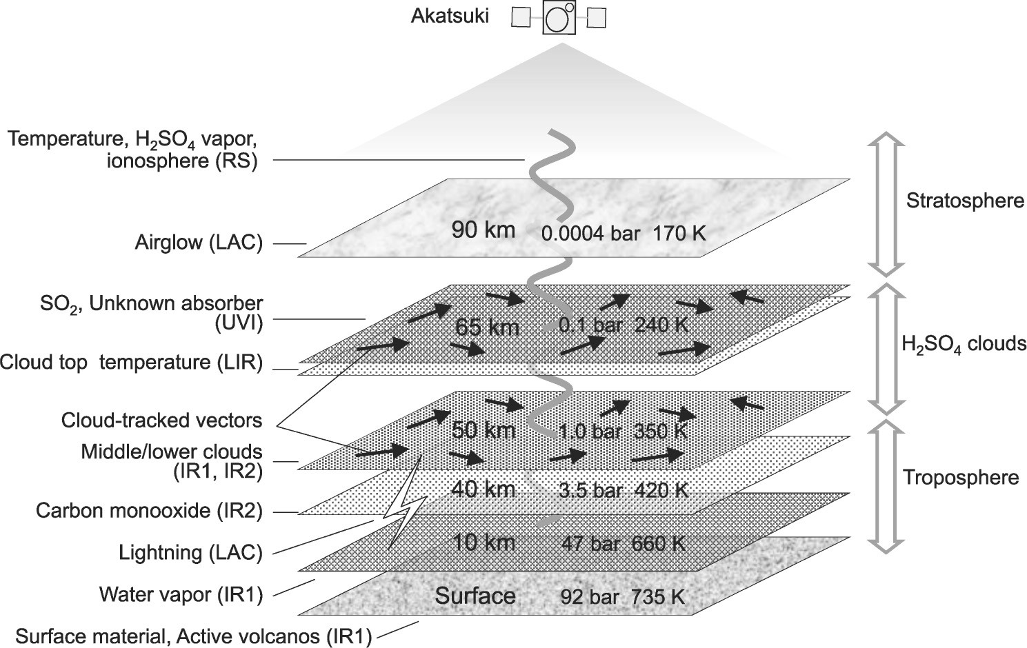 - 장파 적외선 카메라 (LIR): 구름이 열을 방출하는 파장에서 고고도 구름의 구조를 연구한다 (10 μm).