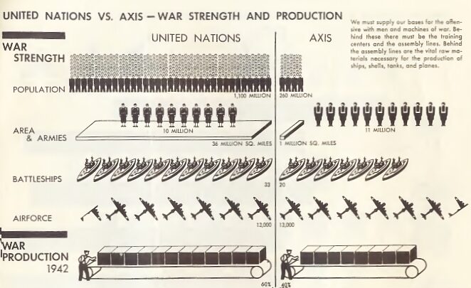 1941년 3월부터 미국은 무기 대여법을 통해 연합국에 물자를 지원했다. 영국은 총 501억달러 중 314억달러를 지원받았으며, 이는 대출이 아닌 무상 지원이었다.[22]