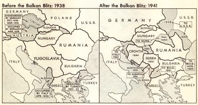 히틀러는 발칸반도를 확보하기 위해 1940년 루마니아를 추축국에 가입시켰고, 헝가리(1940년 11월)와 불가리아(1941년 3월)도 추축국에 합류했다.[135] 유고슬라비아는 1941년 3월 독일과 동맹을 맺었지만, 곧 반나치 쿠데타가 발생했다.[137] 독일은 베오그라드를 폭격하고 유고슬라비아를 침공, 분할했다. 안테 파벨리치의 독립 크로아티아국은 추축국 동맹국이 되어 세르비아인과 유대인을 학살, 추방했다.[139][140][141]