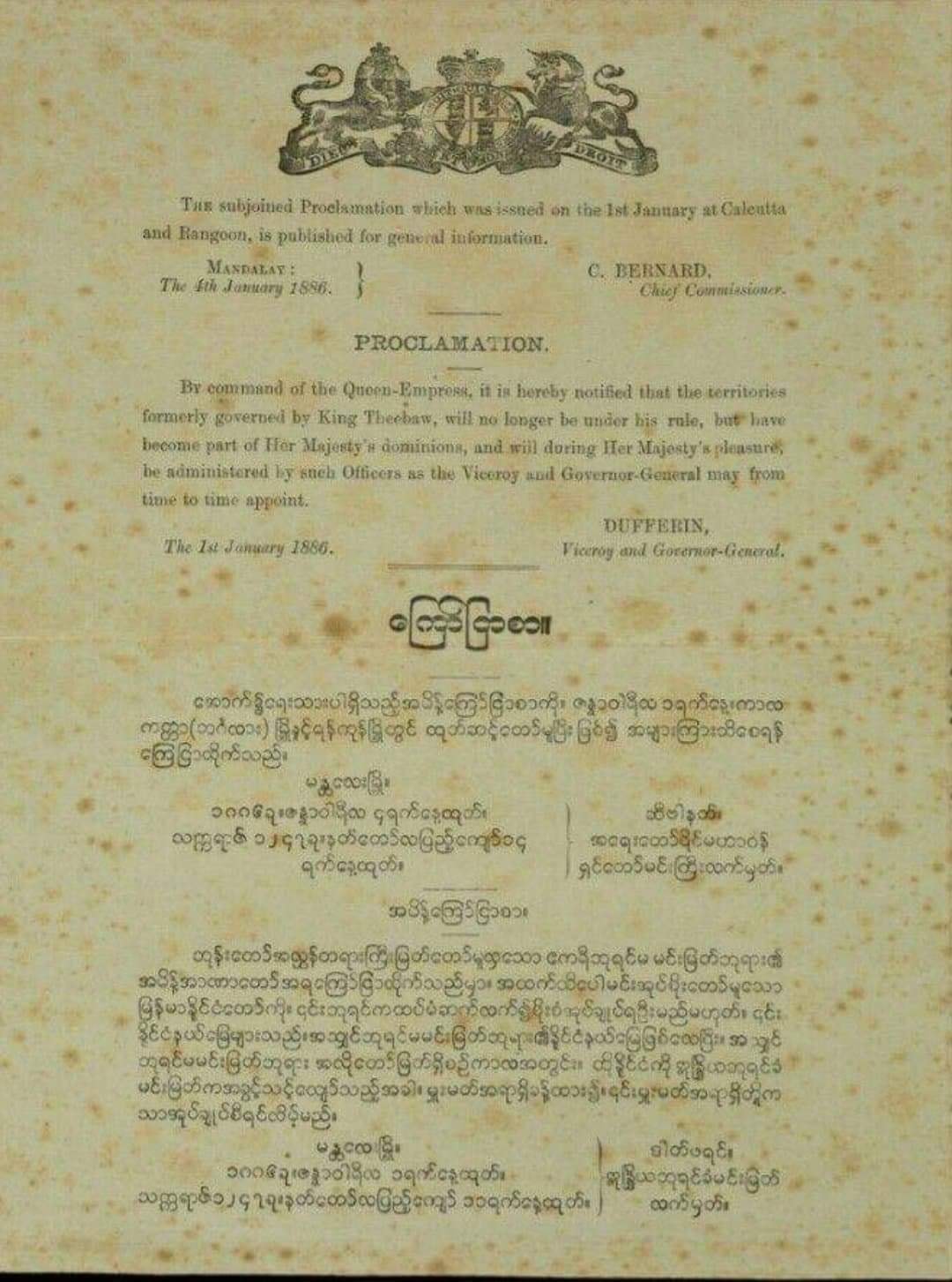 1886년 1월 1일, 인도 총독 듀퍼린 경은 미얀마를 영국에 합병한다고 선포했다.[5] 이 선포문은 다음과 같다.