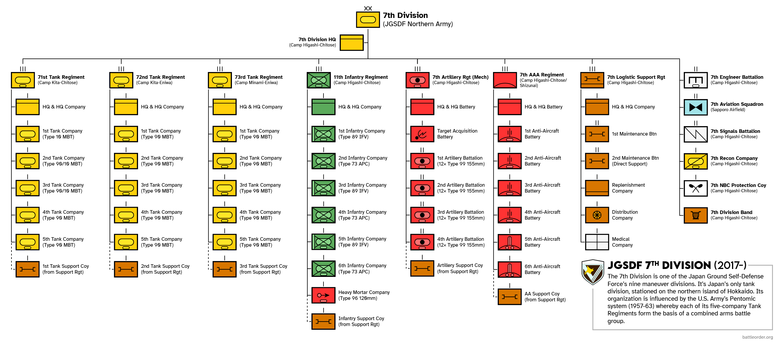 제7사단은 일본 육상자위대의 기갑사단으로, 1955년 12월 1일 제7혼성단으로 창설되어 1962년 제7사단으로 개편되었다. 홋카이도 이부리 및 히다카 지역의 방위 및 경비를 담당하며, 3개의 전차 연대, 1개의 기계화 보병 연대 등을 예속하고 있다. 74식, 90식 전차 등을 운용하며, 재해 파견 및 국제 평화 유지 활동에도 참여했다.