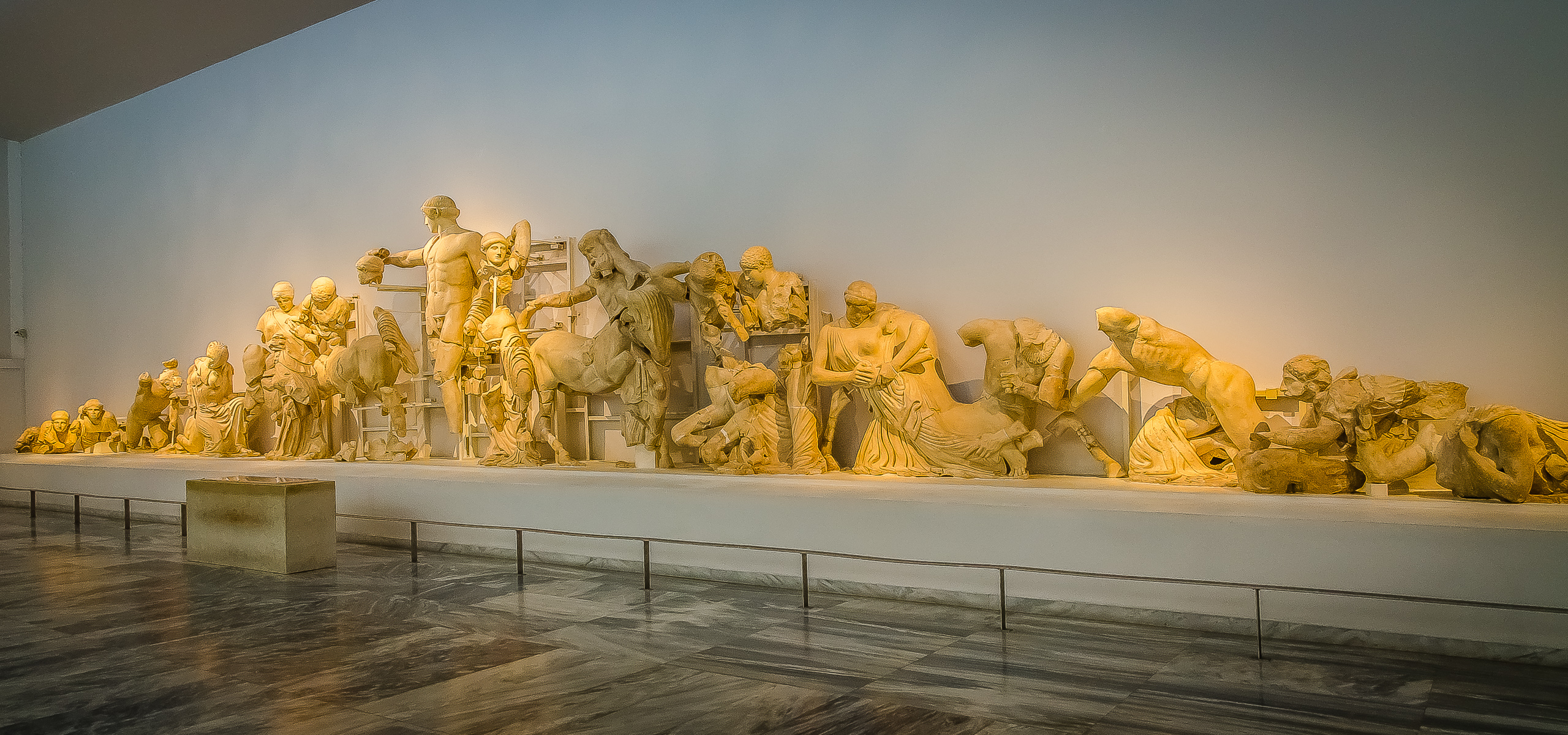 주요 구조물은 품질이 좋지 않은 지역산 다공성 석회암으로 만들어졌기 때문에, 조각 장식과 일치하도록 대리석처럼 보이도록 얇은 회반죽 층으로 덮었다. 지붕은 펜텔리 대리석 타일로 덮여 있었는데, 반투명할 정도로 얇게 잘라져서 여름날에는 "각 1,000개의 타일을 통해 일반적인 20와트 전구에 필적하는 빛이 비쳤을 것"이라고 한다.[5]지붕 가장자리에서는 102개의 사자 머리 모양의 물받이(가고일)가 튀어나와 있었으며, 이 중 39개가 현존한다. 물받이 양식의 불일치는 로마 시대에 지붕이 수리되었음을 증명한다.[6]