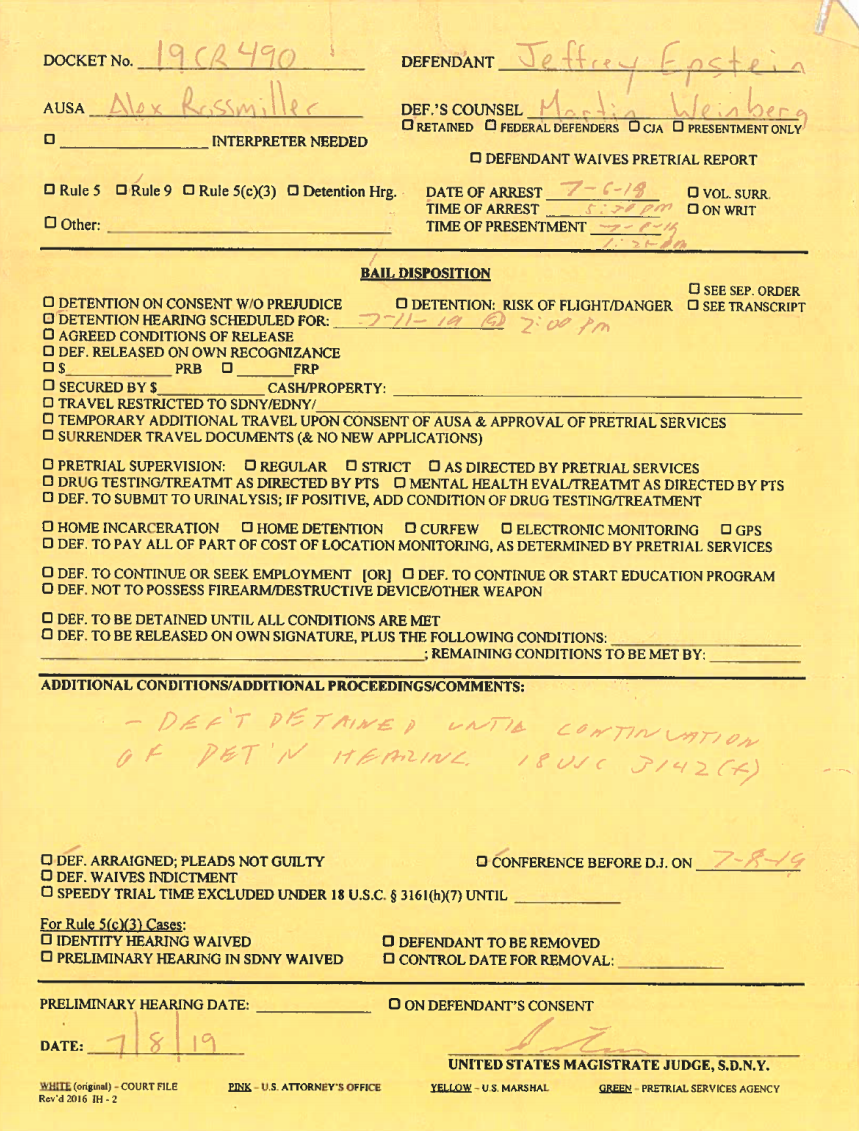 엡스타인은 1억 달러의 보석금을 제시하고 뉴욕시 저택에서 가택 연금을 받는 조건으로 석방을 요청했으나,[133] 미국 지방 법원 판사 리처드 M. 버먼은 7월 18일, 에프스타인이 대중에게 위험을 초래하고 기소를 피하기 위해 도주할 위험이 크다고 판단하여 이 요청을 거부했다.[133] 2019년 8월 29일, 에프스타인이 교도소 감방에서 사망한 지 19일 후, 버먼 판사는 에프스타인에 대한 사건을 종결했다.[11][12] 검찰은 공모자에 대한 수사를 계속할 것이라고 밝혔다.[12]