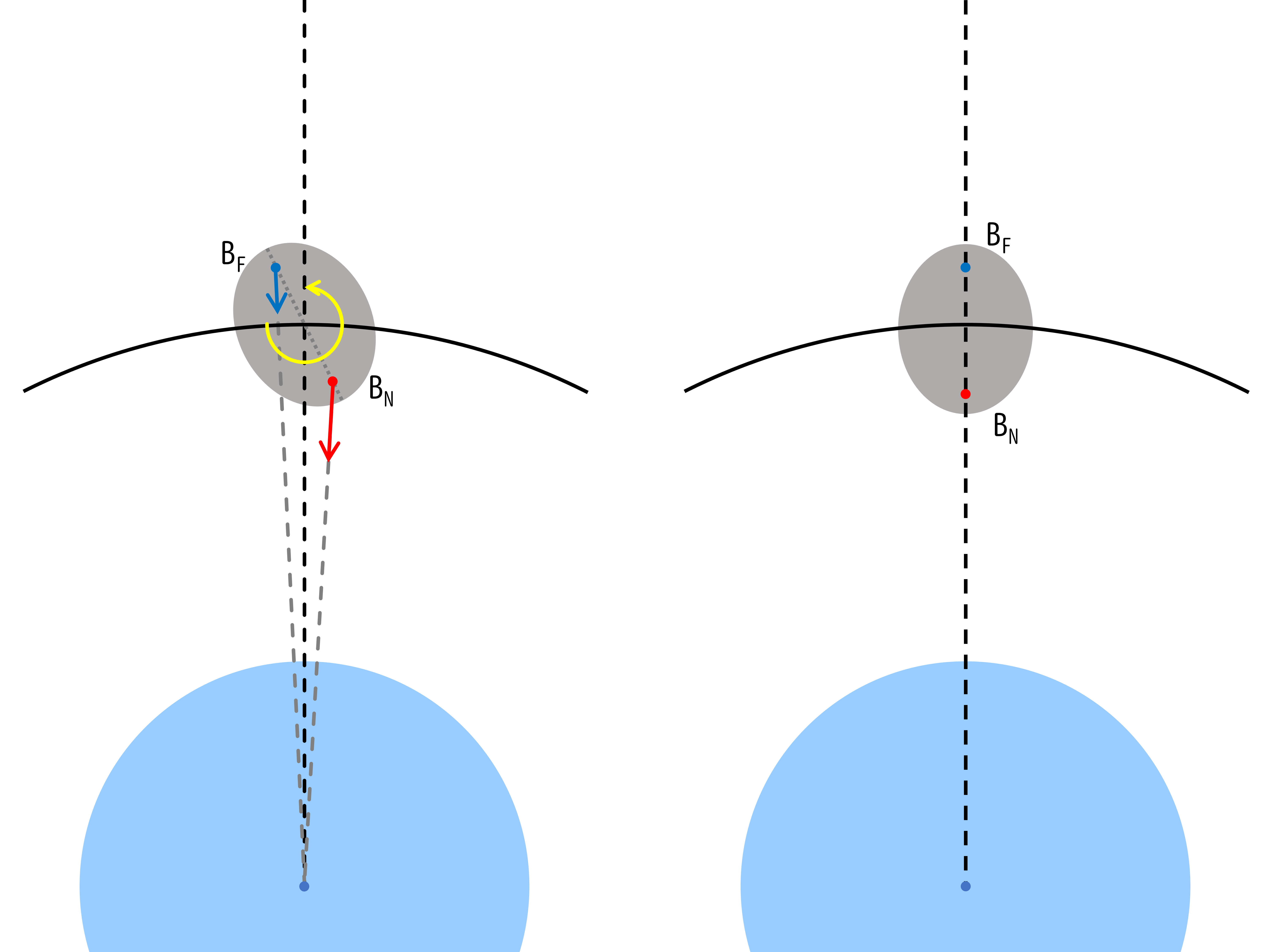 융기가 이제 A-B 축에서 벗어나기 때문에 융기 내 질량에 대한 A의 중력은 B에 토크를 가한다. A를 향하는 융기에 가해지는 토크는 B의 회전을 궤도 주기와 일치시키고, A에서 멀리 떨어진 "뒤쪽" 융기는 반대 방향으로 작용한다. 그러나 A를 향하는 쪽의 융기는 뒤쪽 융기보다 B의 지름만큼 더 A에 가까우므로 약간 더 강력한 중력과 토크를 경험한다. 따라서 두 융기에서 나오는 순 토크는 항상 B의 회전을 궤도 주기와 동기화하는 방향으로 작용하여 결국 조석 고정으로 이어진다.
