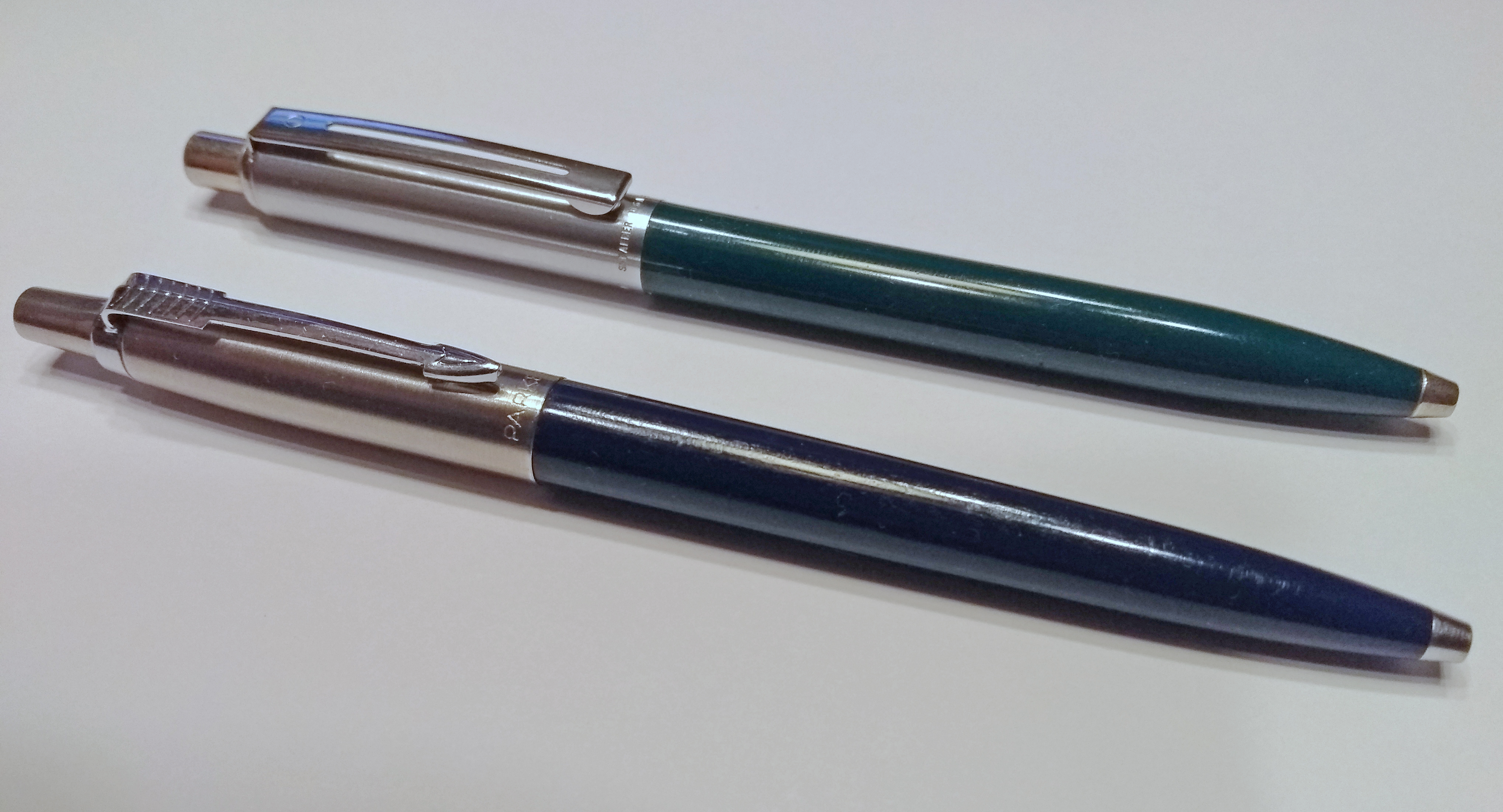 쉐퍼(Sheaffer) 센티넬 앞에 놓인, 단종된 황동 내부 캡 나사산을 특징으로 하는 파커 조터