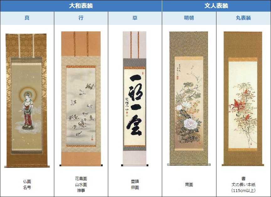 - '''야마토 표구''' : 그림으로 나타낸 양식. 상(천)·중회전·하(지)의 세 단으로 나뉘며, 상단에는 풍대라는 띠 모양의 것을 한 쌍으로 내건다. 가장 일반적인 양식이다.