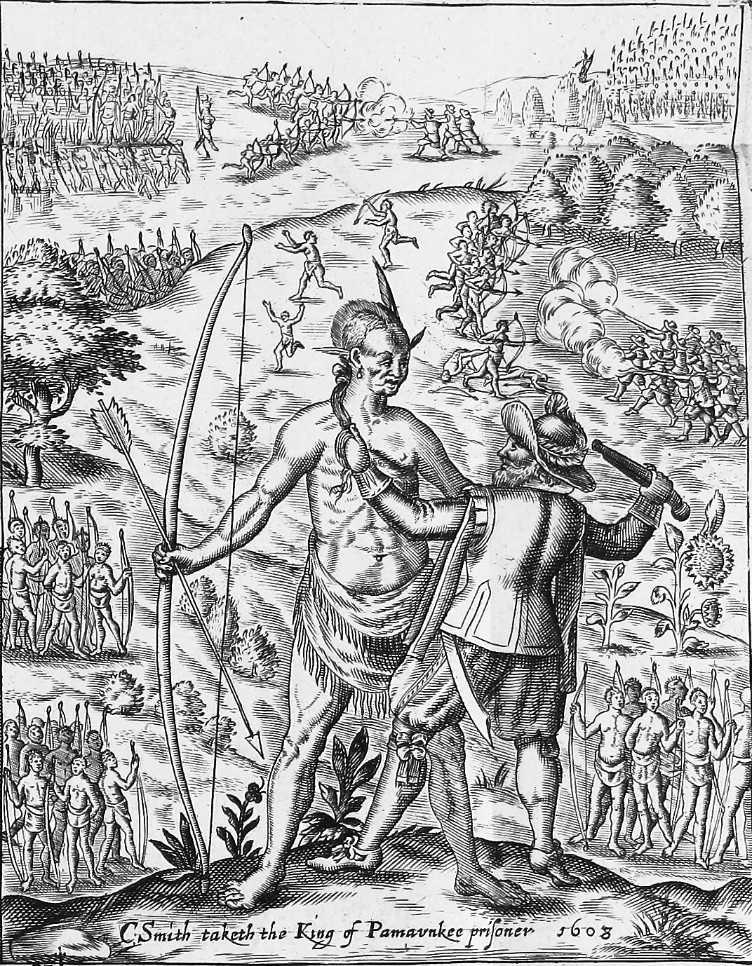 제임스타운 초기 정착 시기, 포우하탄 연맹과의 관계는 식민지의 생존에 매우 중요했다. 1607년 12월, 치카호미니 강 유역에서 식량을 구하던 존 스미스는 오프차나카노가 이끄는 포우하탄족 전사들에게 포로로 잡혔다. 그는 포우하탄 연맹의 중심 마을인 웨로워코모코로 끌려가 연맹의 최고 추장인 와훈소나코크(오프차나카노의 형) 앞에 서게 되었다.[24][25][61]