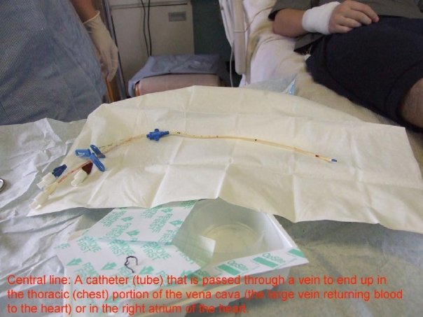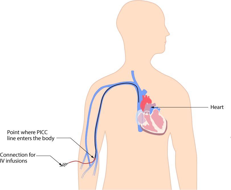 - 말초삽입 중심정맥관 (PICC): PICC 라인이라고도 하며, 팔의 정맥 (상완 정맥 또는 요골 정맥)을 통해 삽입하는 중심정맥관이다. 상완 정맥은 요골 정맥보다 크고 팔을 통해 더 곧게 뻗어 있어 삽관에 더 적합하다. 카테터의 끝은 상대정맥에 위치한다.[1] PICC 라인은 중심정맥관보다 직경이 작고 길이가 훨씬 길어 (50–70cm 대 15–30cm) 유체 흐름 속도가 느리므로, 빠르고 대량의 수액 소생술에는 적합하지 않다. 또한 쉽게 막힐 수 있으며 페니토인과 함께 사용할 수 없다.[39] 정맥 혈전증과 협착을 유발할 수 있어 만성 신장 질환 환자에게는 주의해서 사용해야 한다.[40][41]
