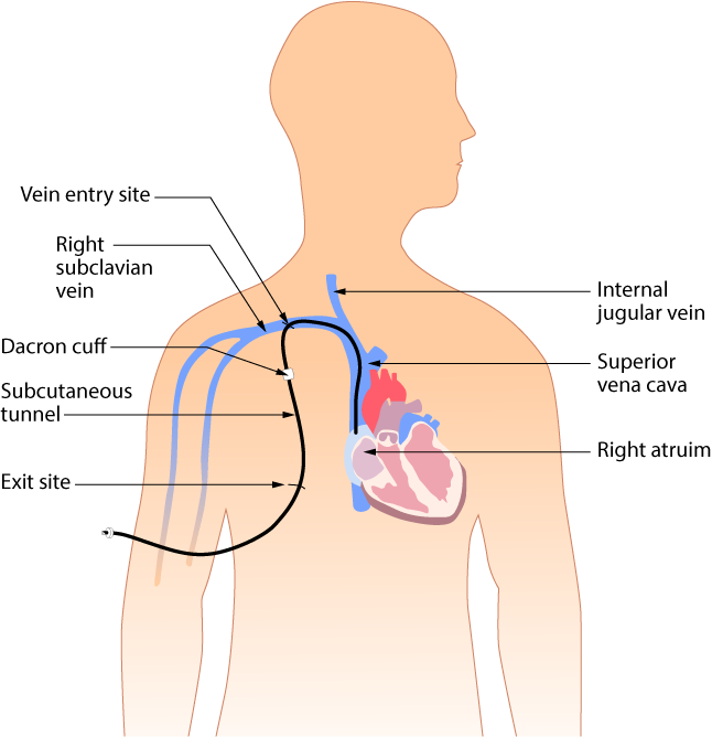 터널 카테터는 몇 달에서 몇 년 동안 삽입된 상태로 유지될 수 있다. 삽입 부위 근처의 카테터를 둘러싸고 항균 용액으로 코팅된 Dacron 커프(항균 커프) 덕분에 감염률이 낮으며, 삽입 후 2~3주 후에 카테터를 제자리에 고정한다.[39]