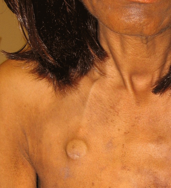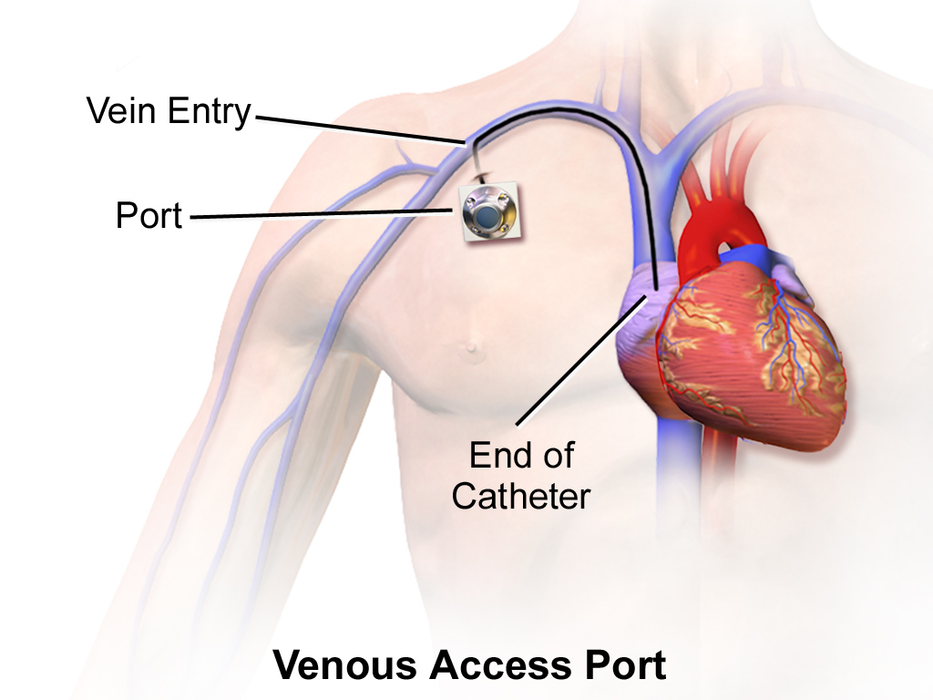 - 이식형 중심정맥관 (ICVC, 포트): 포트라고도 하며, 터널형 카테터와 유사하지만 피부 아래에 완전히 이식된다. 포트를 통해 약물을 주입하며, 일부 포트는 동일한 방식으로 재충전할 수 있는 작은 저장소를 포함한다. 저장소는 약물을 혈류로 서서히 방출한다. 외과적으로 쇄골 아래에 삽입되며, 카테터는 큰 정맥을 통해 심장 (우심방)으로 삽입된다. 삽입 후에는 "그리퍼" 비관통형 Huber-팁 바늘 (PowerLoc는 한 브랜드)을 사용하여 포트에 접근한다. 바늘 어셈블리에는 짧은 길이의 튜브와 캐뉼라가 포함되며, 피부를 통해 직접 삽입된다. 국소 마취제를 사용할 수 있다. 포트는 약물, 화학 요법 및 혈액 샘플 채취에 사용될 수 있으며, CVC 또는 PICC 카테터보다 유지 관리가 쉽고 감염 위험이 낮다.[1]